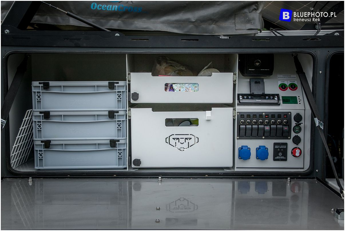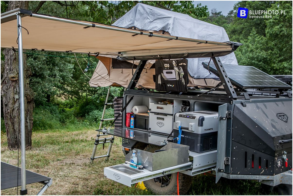 Korpus przyczepy, wykonany z aluminium jest bardzo praktyczny. Z przodu bardzo duży luk na butle z gazem czy inne elementy wyposażenia, które nie musza być szczelnie zamknięte. Po bokach praktyczne drzwiczki kryjące wiele przydatnych na kempingu funkcji: prysznic , małe schowki na offroadowe wyposażenie, schowki na mniejsze bagaże, szuflady na wyposażenie zapasy i to co najbardziej efektowne: wysuwana kuchnia ze zlewem oraz duża kompresorowa lodówka Waeco (35l). Poziome drzwi są także użyteczne dla przykładu od strony części kuchennej są wykonane ze stali nierdzewnej, które są bezpieczne dla żywności i służą za miejsce na przygotowanie posiłków.