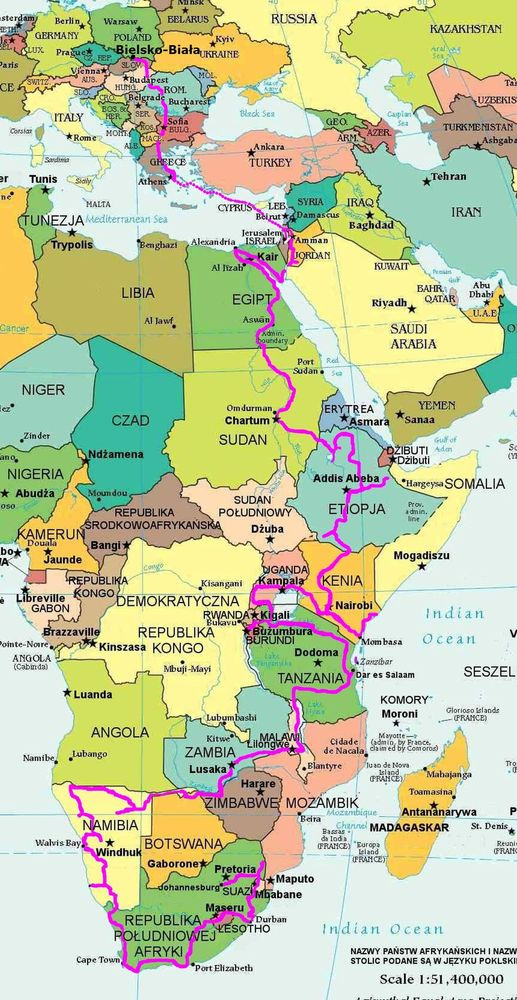 Opony BFGoodrich All Terrain sprawdziły się znakomicie, tylko jeden defekt na całej trasie, a stan bieżnika po takim przebiegu, używając cały czas jednego kompletu opon oceniam, na przód 60% , tył 70% zużycia. Przy założeniu producenta pojazdu wykonywania obsługi co 20tys. km, dokonaliśmy jedynie raz wymiany oleju i smarowania przegubów krzyżakowych wału napędowego po 21tys. km. w Nairobi, a teraz przyjdzie dopiero czas na pełny obsługowy serwis. Z powodu używania złej jakości oleju napędowego na prawie całej, afrykańskiej trasie tuż przed dojazdem do Polski, zaświeciła się kontrolka zanieczyszczenia filtra paliwa. Ponadto, z powyższego problemu, zaobserwowaliśmy w pewnych okresach zwiększenie wydobywającego się z rury wydechowej niebieskiego dymu, już teraz po konsultacji z serwisem wiemy, że był za to odpowiedzialny system D-Cat, gdzie w nowoczesnych dieslach Toyoty, filtr cząstek stałych wytrąconych podczas spalania jest oczyszczany automatycznie, poprzez wtrysk paliwa do kolektora wydechowego, które spalając się, podnoszą temperaturę wydechu i umożliwiającą wypalenie zebranych w filtrze cząstek sadzy. My, myśleliśmy podjeżdżając pod długie wniesienie w Izraelu, że się nam auto zapaliło, a to włączył się system wypalania nagromadzonej sadzy w filtrze układu wydechowego i wszystko było OK! Takie kłęby dymu, wydobywające się z innych pojazdów jeżdżących po Afryce na kiepskim oleju napędowym, było nam dane obserwować każdego dnia.