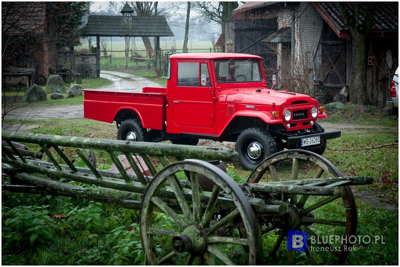 Gdy trochę się przejaśnia odpalamy FJ-kę która obecnie jest na sprzedaż i ruszamy na pola szukać scenografii do zdjęć. Auto jest w idealnym stanie. Opisywana na wstępie niedokładność w odbudowie dotyczy braku zawiasu w dolnej części maski (są wsporniki po bokach). Egzemplarz, który oglądam, pochodzi w Holandii, gdzie pracował dzielnie w straży pożarnej. Po zakupie przez Zbigniewa Nowosielskiego został przywrócony do stanu fabrycznego, tzn. pozbawiony pompy na zderzaku przednim. Odbudowa odbyła się z użyciem oryginalnych części (blachy i elementy mechaniczne) zakupionych w Toyocie.