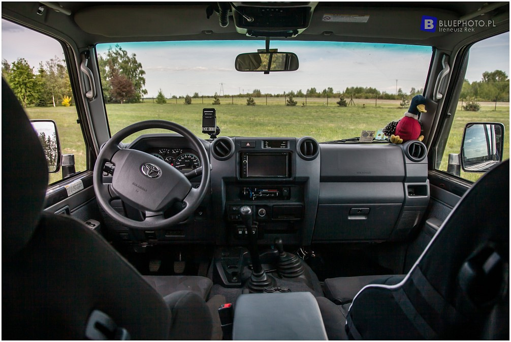 Kolejnym, istotnym usprawnieniem pojazdu była też wymiana foteli. Oryginalnie HZJ76 wyposażony jest w fotel kierowcy oraz podwójną kanapę dla dwóch pasażerów z przodu. Takie rozwiązanie absolutnie nie sprawdza się w długich trasach. Fotele z przodu zastąpił więc produkt Recaro, na który trafiły szyte na zamówienie pokrowce. Uzyskane w ten sposób miejsce pomiędzy fotelami uzupełnił wykonany własnoręcznie podłokietnik zaopatrzony w gniazda do ładowania, wnęki na kubki i specjalny, wyprofilowany pod posiadany sprzęt, schowek na aparat fotograficzny, który dzięki temu jest zawsze pod ręką.