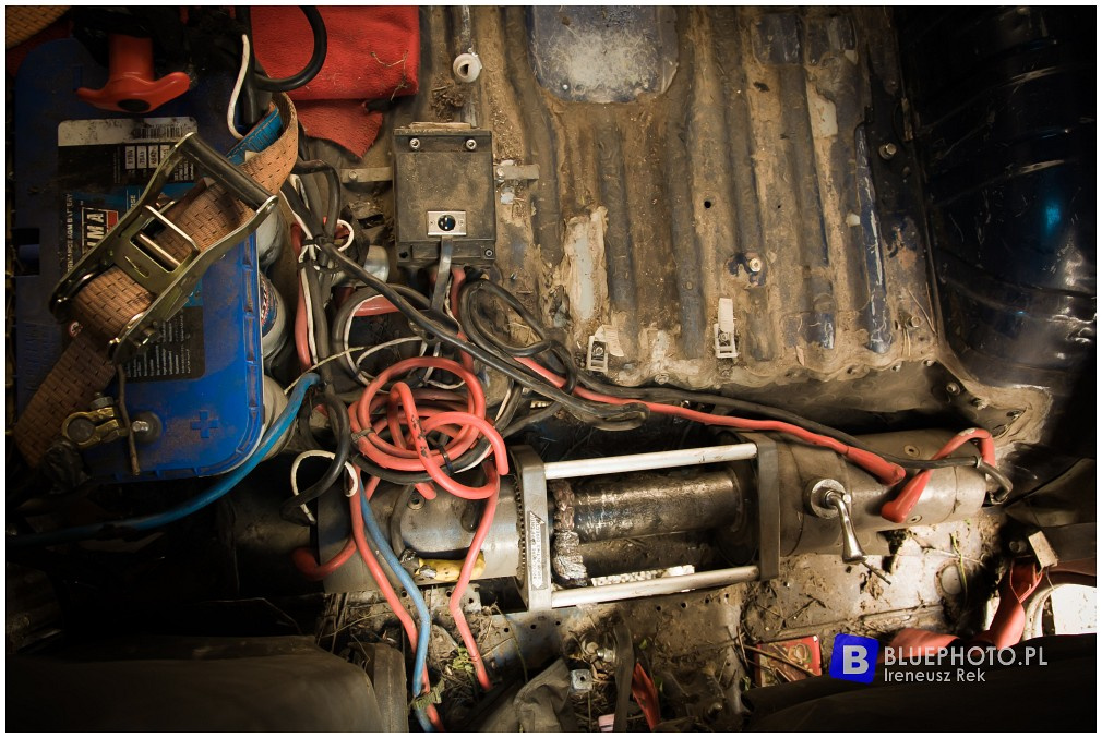 Podniesione zawieszenie i gumy to podstawa. Snorkel wydłubany własnoręcznie, wyspawane orurowanie. Z rzeczy nietypowych – do auta dołożony jest drugi alternator, aby wystarczyło prądu do ładowania dwóch akumulatorów żelowych, mocna wyciągarka elektryczna umieszczona centralnie w aucie, intercooler dorobiony z osobówki, kompresor do pompowania kół, opony z wewnętrznym beadlockiem, umożliwiające jazdę z ciśnieniem powietrza nawet 0,4Atm. To auto to dowód triumfu człowieka nad materią. Żeby jeździć lepiej potrzebne są modyfikacje. Żeby nie płacić za te zmiany krocie, potrzebna jest pomysłowość. I oni to mają…