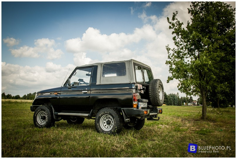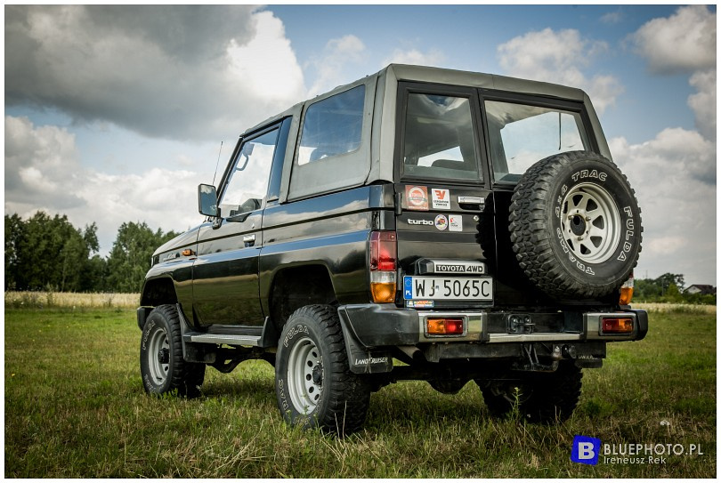 Opisywane auto to model LJ70 z 1992 roku, wyprodukowany już po zmianie wyglądu karoserii i podniesieniu mocy dieslowskiego silnika do 90 KM. Przez pierwszego właściciela używane do rekreacyjnych wycieczek wśród kanałów i wiatraków Holandii. Do Polski sprowadzone przez myśliwego, który zamierzał przysposobić je do przemierzania leśnych ostępów jednak na zamiarach się zakończyło. I może bardzo dobrze, bo dzięki temu, poza zmienionym zawieszeniem na Dobinsons +2 cale i oponami FULDA 4x4 w rozmiarze 31", jest zachowane w idealnym, oryginalnym stanie. Co ciekawe miękki dach pomimo upływu dwudziestu kilku lat jest elegancko i mocno napięty, szczelny i zachowany w całości, łącznie ze wszystkimi suwakami używanymi do odchylania bocznych połaci. Pod maską auto bardzo żwawo rozpędza silnik diesla 2,4l 2L-T II. Do pokonywania terenu służy dołączany ręcznie napęd przednich kół, jednak zaopatrzonych w bardziej komfortowe rozwiązanie czyli automatyczne sprzęgiełka, co oznacza, że aby włączyć napęd 4x4, nie trzeba wysiadać z kabiny auta, jak to się dzieje w przypadku sprzęgiełek manualnych, w które wyposażano większość 70-ek. Podobno jest to rozwiązanie bardzo awaryjne, jednak obecny właściciel nie raportuje tego problemu pomimo, że auto obowiązkowo stawia się na każdym Toyotowym spotkaniu z serii MAZOVIA OUTBACK organizowanym przez klub.