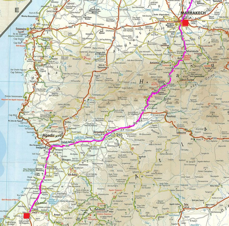 Uzupełniamy zapasy i kierujemy się na południe, drogą R203 w kierunku Asni i pasma gór Wysokiego Atlasu. Tuż za Asni, rozstajemy się z Przemkiem, bierze swój plecak i rusza w góry pod „Diebel Toubkal” (4167m. n.p.m.). My jedziemy dalej i po następnych 70km, na przełęczy Tizi-n-Test, na wys. 2092 m n.p.m., przecinamy to pasmo górskie. Krajobrazy to brąz zmiksowany z zielenią, góry do oglądania podały się nam z posypką, a droga miejscami wiła się agrafkami. Zjeżdżamy do Taroudant i pozostawiając z boku Agadir (nie zwiedzamy ponownie mniej ciekawych miejsc), jedziemy do miejscowości Tiznit, gdzie tuż za miastem lokujemy się na campingu (60 MAD od auta).