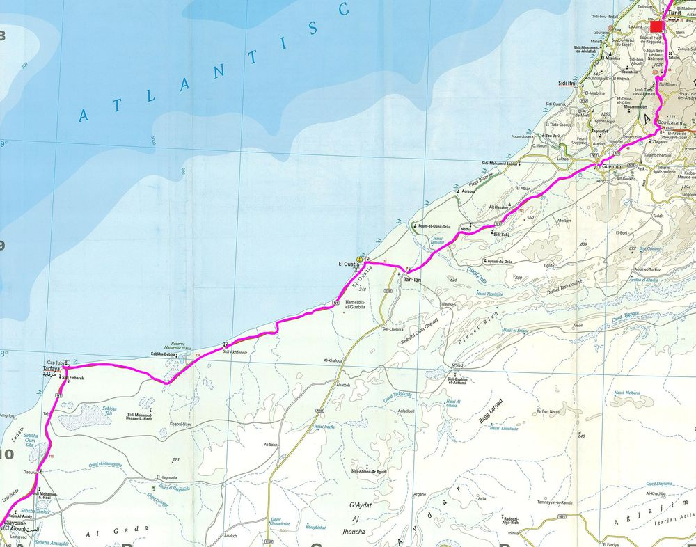 Tinzit > El Ouatia > Tarfaya (hiszpański fort) > Laayoune > Lemsid (spanie na stacji paliw „Atlas” – hałas i smród) – 650km