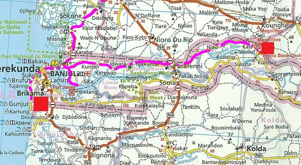 Gunjur > prom poprzez rzekę Gambia > Barra > Albadarr – Fort James na Kunta Kinteh Island > Faraffenni > Wassu (nocleg na parkingu w wiosce) – 310km