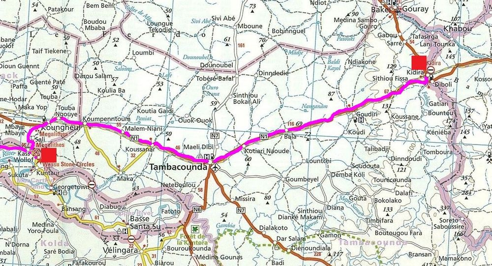 Teraz pozostało nam przeprawić się najkrótszą trasą ponownie do Senegalu, biorąc pod uwagę fakt iż będziemy dalej jechać na wschód w kierunku Mali. Po małym wywiadzie na miejscowym posterunku żandarmerii, mamy informację, że istnieje taka możliwość i to kilkanaście km na zachód od Wassu, obok miejscowości Dingarai. Szukamy i niedowierzając podpowiadającym mieszkańcom wioski, jedziemy miedzą o niewyraźnych śladach kół 3km do granicy. O dziwo jest budynek i jest jakiś celnik (odprawy paszportowej brak). Celnik ma pieczątkę i podbija to, co mu podsuwamy, bez pozostawienia sobie żadnej adnotacji??? Drogi na naszym GPS-e brak, do najbliższego miasta Koungheul na senegalskiej trasie w linii prostej mamy 30km. Jedziemy polnymi drogami, pomiędzy baobabami i miejscowymi uprawami orzeszków ziemnych. Po drodze w jednej z pierwszych wiosek bierzemy miejscowego autostopowicza, który przy tej okazji pokazuje nam właściwą drogę. Wraca z wizyty u swojego ojca w Gambii, mającego kilka żon, do swojej wioski, gdzie mieszka wraz z mamą i rodzeństwem. Domki piramidki, pranie przy studni, kozy, konie osły, skromne sklepiki, bardzo przyjemni ludzie, a wszystko to w gąszczu dzikich traw. Te 30 km przejazdu to niezapomniane wrażenia i chwile tak autentyczne, że sami zastanawiamy się, czy aby dzieje się to naprawdę?