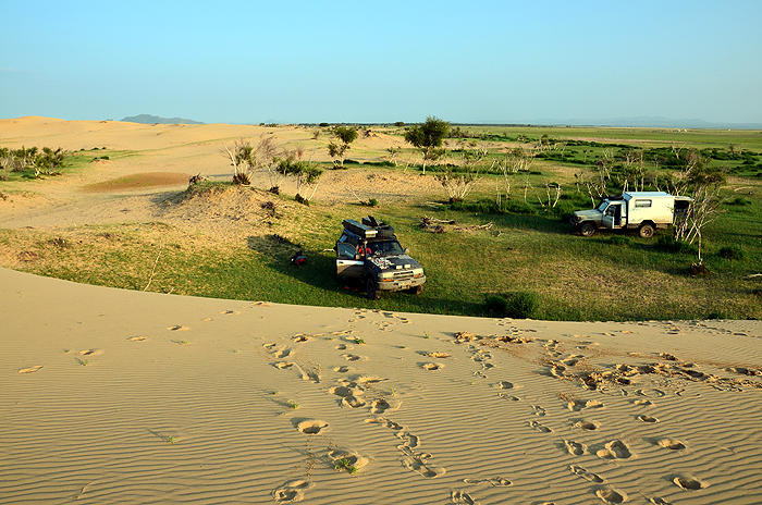 Następny dzień obfitował w wydarzenia. Już o świcie wjechaliśmy na mongolską, szutrową tarkę i skierowaliśmy Toyoty wprost na wydmy. Jest tu taki, wąski przesmyk pomiędzy górami piachu, zaznaczony na mapach wojskowych już w latach ’70-tych. Więc albo wydmy Khongoryn Els się nie przemieszczają, albo... sam nie wiem co. Jednak mimo głównej drogi wiodącej przez przesmyk do wioski Sewrej i tak musieliśmy walczyć z piachem. Silnik dawał z siebie co mógł, a koła robiły pod siebie. Można było oczywiście spuścić trochę powietrza z opon, ale udało się i bez tego. Przydałby się jednak na takie okazje jeszcze większy silnik... tak ze sześć litrów.