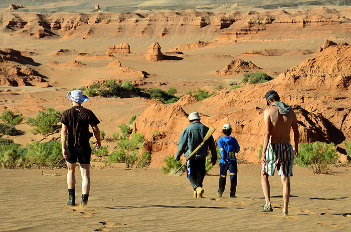 O świcie, tuż po wschodzie słońca, wyruszyliśmy w dalszą drogę na zachód, dnem wyschniętej rzeki Dzulganajn. Ślady kół UAZa niedługo znikły i pozostały nam jedynie słabo widoczne koleiny, prawdopodobnie sprzed roku lub dwóch. W miejscach, gdzie wiosenna woda z roztopów wyżłobiła grunt, nikły i tylko świadomość, że poza dnem rzeki nie ma co szukać drogi, utrzymywała nas ciągle w kanionie. Jego brzegi czasami budowały wysokie, pomarańczowe piargi, osypujące się wielkimi blokami zlepionego dawną siłą piasku. Czasami rzekę Dzulganajn ograniczały wydmy jasno-żółtego piasku. Woda na wiosnę podcinała im nogi, a letnim wiatrem wydmy atakowały ponownie.