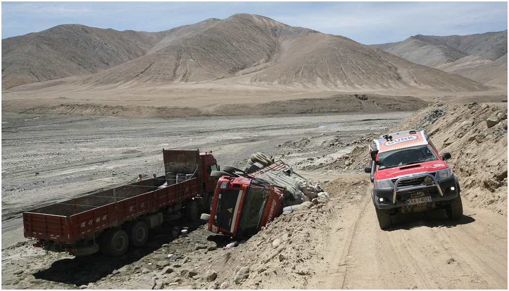 przez spływające po stokach potoki nasz Hilux pokonuje dzielnie. Na wielu trudnych odcinkach z powodzeniem wystarcza nawet tylko tylni napęd. Przez pierwszą przełęcz powyżej 4.000 m n.p.m., Tosor w Kirgizji, przejeżdżamy jak po maśle. Na prawdziwe trudności napotykamy dopiero w chińskim Ladakhu, między Karakorum i Himalajami. Xinjiang-Tibet Highway to jedna z najtrudniejszych, a już na pewno najdłuższa, bo licząca ponad dwa tysiące kilometrów, spośród ekstremalnie trudnych dróg świata. Przejezdna jest tylko przez cztery letnie miesiące w roku, niszczona często przez trzęsienia ziemi. Ilość tlenu w powietrzu na takich wysokościach jest tam zbyt mała nie tylko dla ludzi. Z rury wydechowej kopci jak z piekielnego komina. Wiele aut przypłaca to koniecznością czyszczenia lub nawet wymiany filtrów i instalacji. Ale Hilux daje radę. Pilnując odpowiednio wysokich obrotów silnika można utrzymać moc. Do jedynki redukować trzeba tylko w najtrudniejszych terenowych podjazdach na niepewnym gruncie.