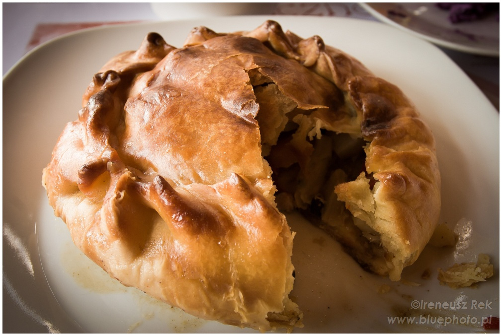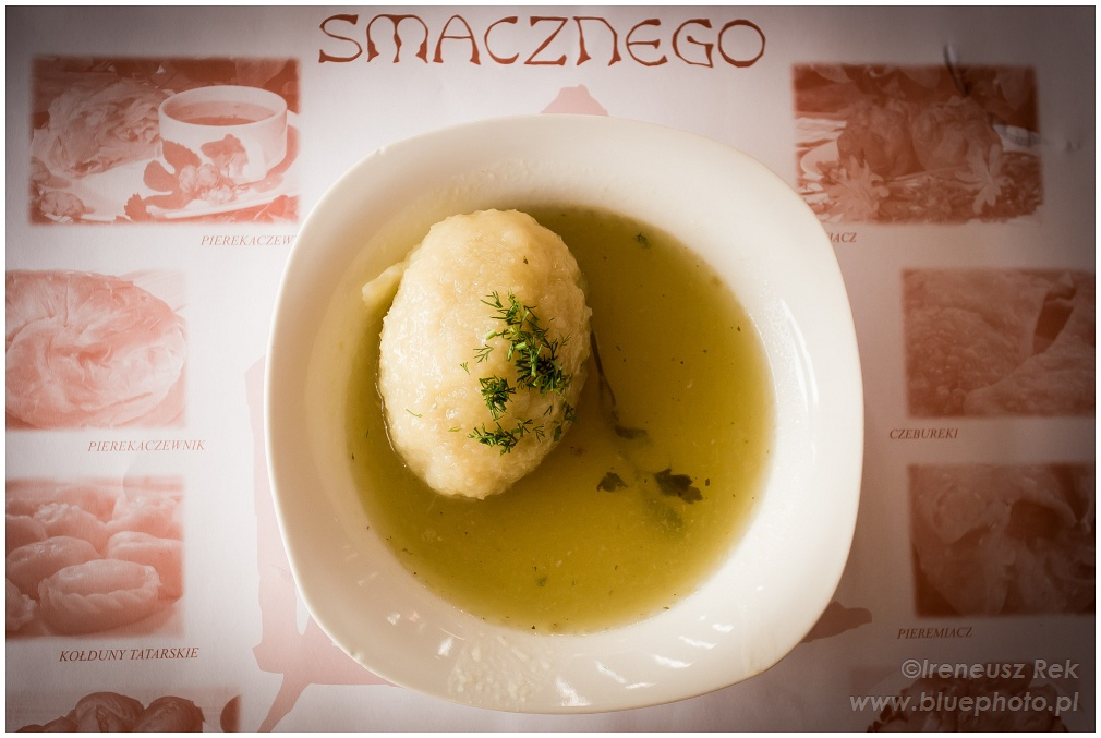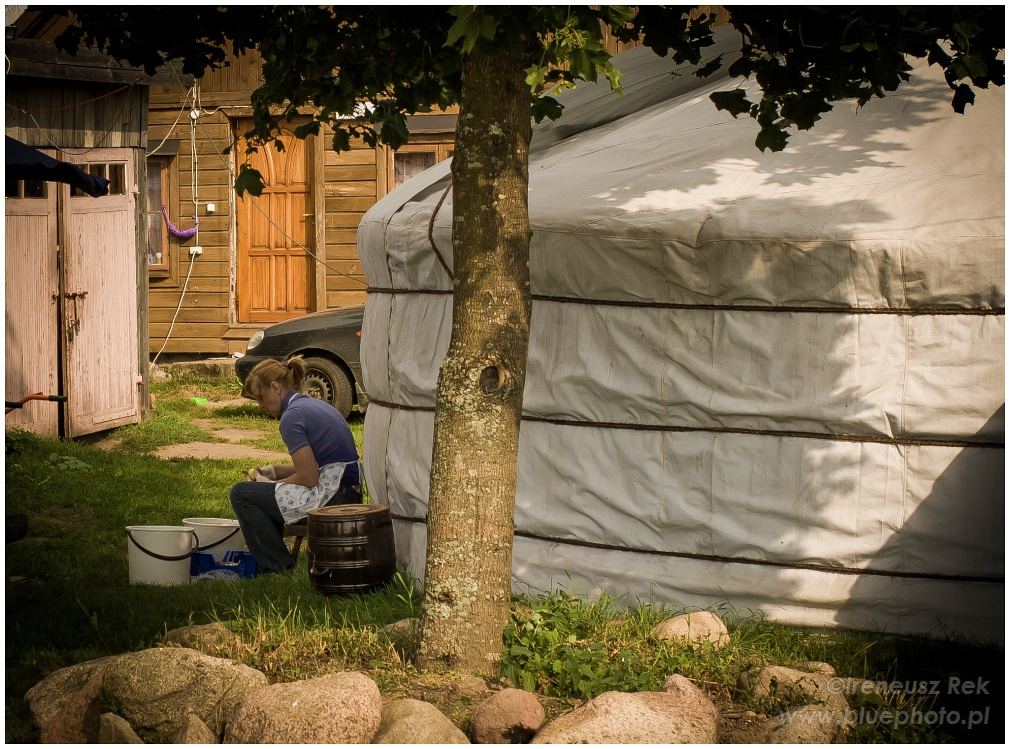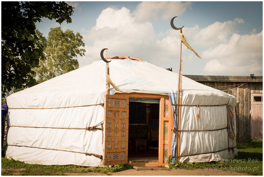 Na miejscu zatrzymujemy się przed drewnianym domkiem jakich wiele tutaj. (Uwaga - wcześniej mijamy restauracje stylizowaną na gospodę ale to nie to miejsce). Jest duży parking, chata z zacienionym i ładnie obrośniętym zielenią tarasem oraz co już bardziej egzotyczne prawdziwa tatarska jurta z wyposażeniem (można wejścia i wszystkiego podotykać, właściciele liczą na uczciwość swoich gości i do tej pory się nie zawiedli ;) oraz zagroda dla koni. Posiłki latem spożywa się na tarasie. Jest sporo ludzi ale i dla nas znalazła się duża ława przy której zmieściło się w sumie dziewięć osób (w tym troje maluchów) Ponieważ chcemy spróbować wszystkiego - zamawiamy wszystko ;). Tzn. wszystkiego po jednej porcji, żeby spróbować. No może oprócz kołdunów w rosole - te każdy ma swoje ;). Potem bielusz i pierekaczewnik. Ten pierwszy jest na cieście drożdżowym natomiast drugi - makaronowym, oba z farszem gęsim lub baranim z dodatkiem cebuli i przypraw spiralnie zawijane. Dalej pieremiacze, dzajma, czak czak i chałwa mączna, Do posiłków dostajemy syte - czystą wodę syconą miodem, doprawioną do smaku sokiem z cytryny. Desery popija się kawą "turecką" gęstą i słodką oraz herbatą, Dziś po kilku latach od wizyty w Kruszynianach (2007r) nie potrafię już dokładnie opisać co jak smakowało. Pozostało tylko ogólnym wrażeniem - wszystko było pyszne.