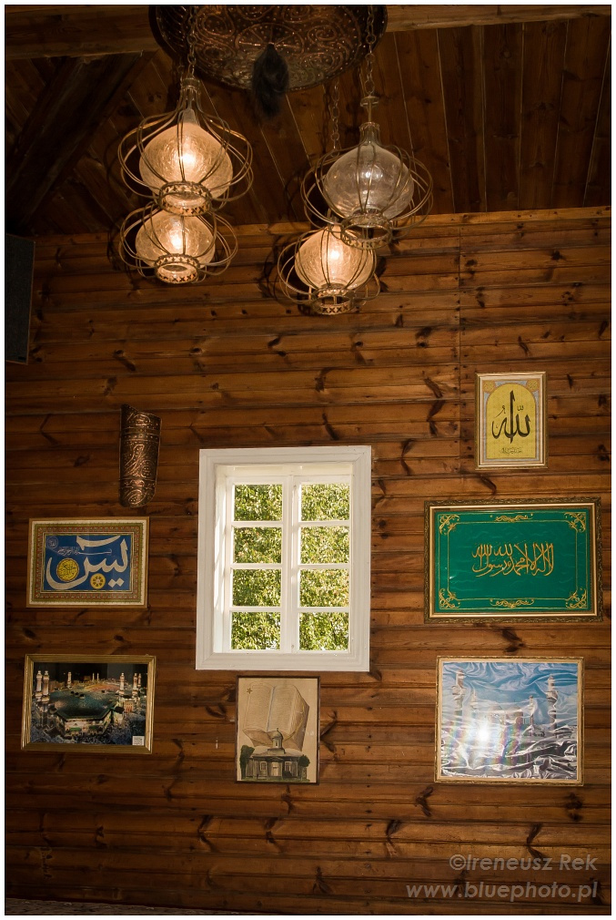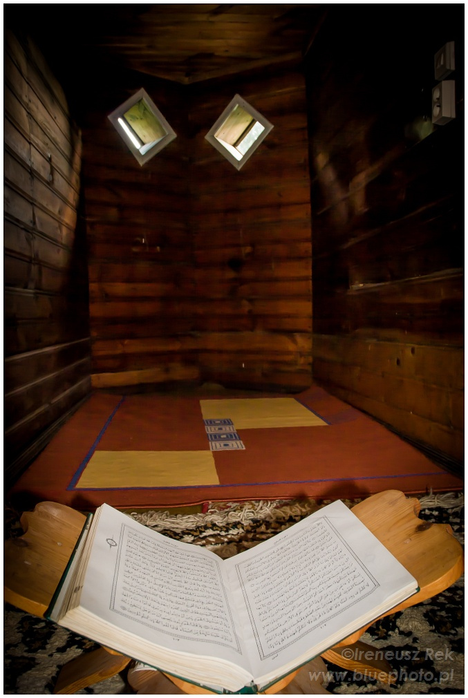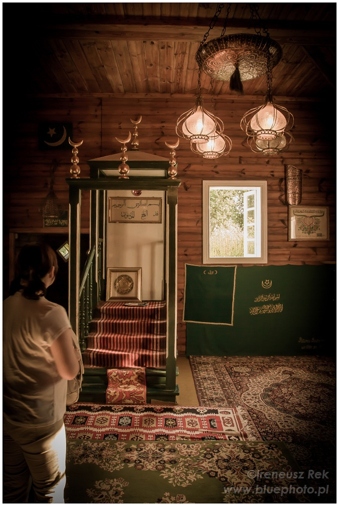 Na pierwszy rzut oka świątynia przypomina podlaskie kościółki - drewniana, na rzucie prostokąta z dwoma wieżyczkami. Ich architektura wynika z faktu iż były budowane przez ludność nie tatarska, nie znającą innego stylu budownictwa. O ich islamskim charakterze świadczą z zewnątrz tylko półksiężyce umieszczone na szczytach minaretów wieżowych i jednym sygnaturkowym. Wejście do świątyni znajduje się we w bocznej ścianie meczetu. Tedy wchodzą na modlitwę mężczyźni oraz turyści obojga płci. Dla kobiet miejscowi wyznawcy religii Mahometa wyznaczyli osobne drzwi znajdujące się w szczycie budynku, pod wieżami. W wejściu wita nas miły przewodnik, który inkasuje drobne datki na rzecz świątyni i wprowadza w historię tutejszej ludności oraz zasad wiary w islamie. Dowiadujemy się np. iż podstawowe obowiązki religijne muzułmanów to tzw. pięć filarów islamu: wyznanie wiary - szahada, modlitwa - sałat, jałmużna - zakat, post - saum, pielgrzymka do Mekki - hadżdż. Ani słowa o zabijaniu niewiernych... Ciekawe. A dżihad? Otrzymujemy odpowiedź, że w teologii i prawie muzułmańskim słowo to oznacza wzmożenie wysiłku i dołożenie wszelkich starań w celu rozwoju islamu (np. poprzez zdobywanie wykształcenia, rozwój gospodarczy). Z kolei niektóre skrajne ugrupowania muzułmańskie rozumieją dżihad jako walkę zbrojną z niewiernymi. Nazwanie dżihadu "wojną świętą" wiąże się podobno z wyprawami krzyżowymi i jest pojęciem europejskim
