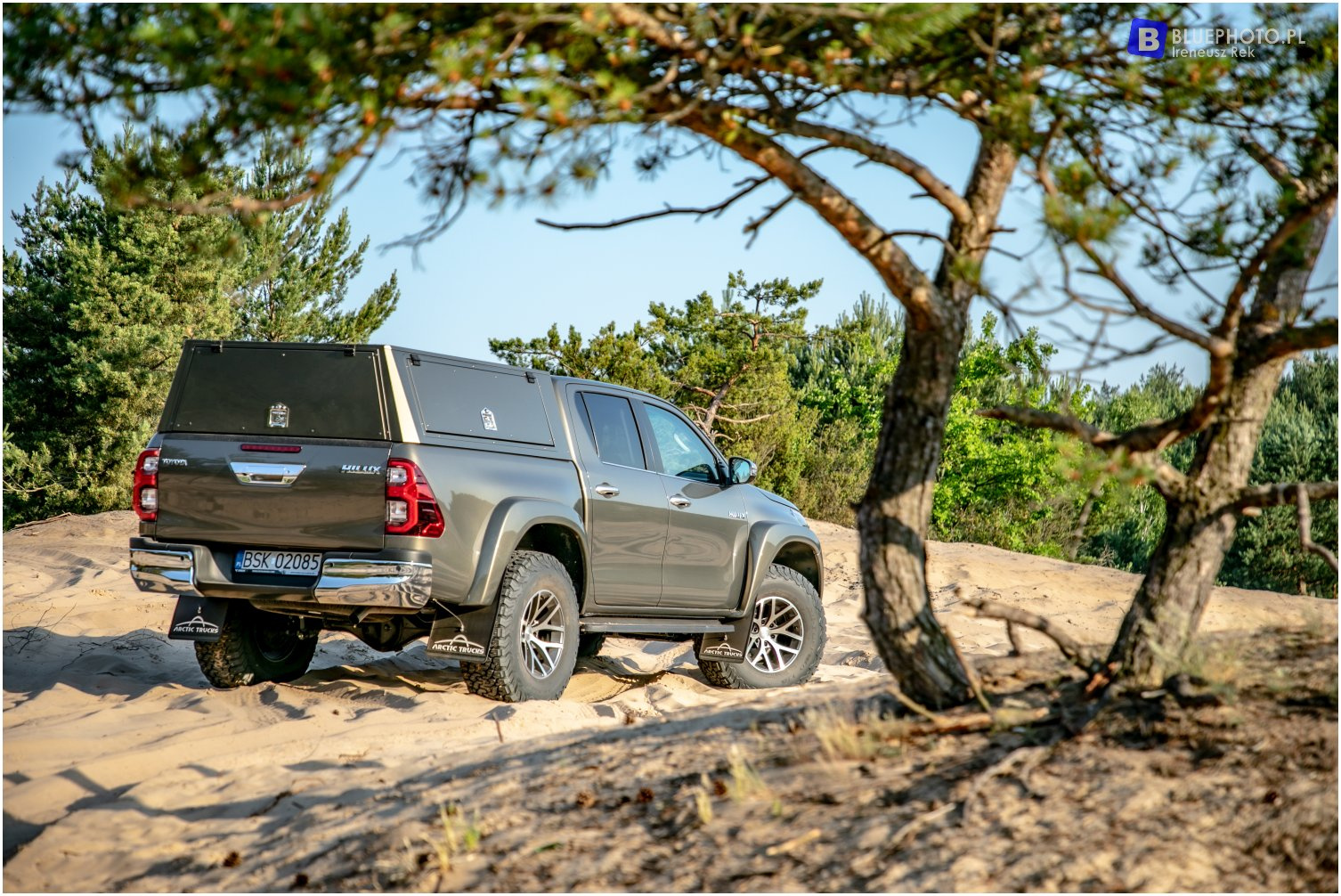 Modyfikacja Hiluxa, szczególnie z silnikiem 2.8, zgodnie ze specyfikacją AT35 jest warta uwagi. Auto zyskuje nie tylko na wyglądzie, ale również znacząco poprawiają się jego parametry terenowe. Co ciekawe, jak sprawdziłem, z tak dużymi kołami Hilux w trasach przelotowych, poruszając się ze stałą prędkością 100-120 km/h, spala sporo poniżej 10 l/100 km ropy. Zużycie paliwa drastycznie za to rośnie w terenie. Wiadomo, większe obciążenia to więcej mocy, którą trzeba uzyskać. Jednak co ważne ta moc jest dostępna od razu i nie skrępowana żadnymi systemami czy programami (w czasie jazdy z zapiętym reduktorem wszystkie opcje bezpieczeństwa jazdy, stabilizacji toru jazdy, antykolizyjny itp. są wyłączane z automatu).