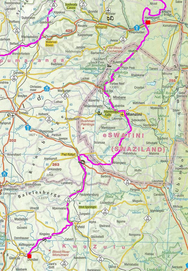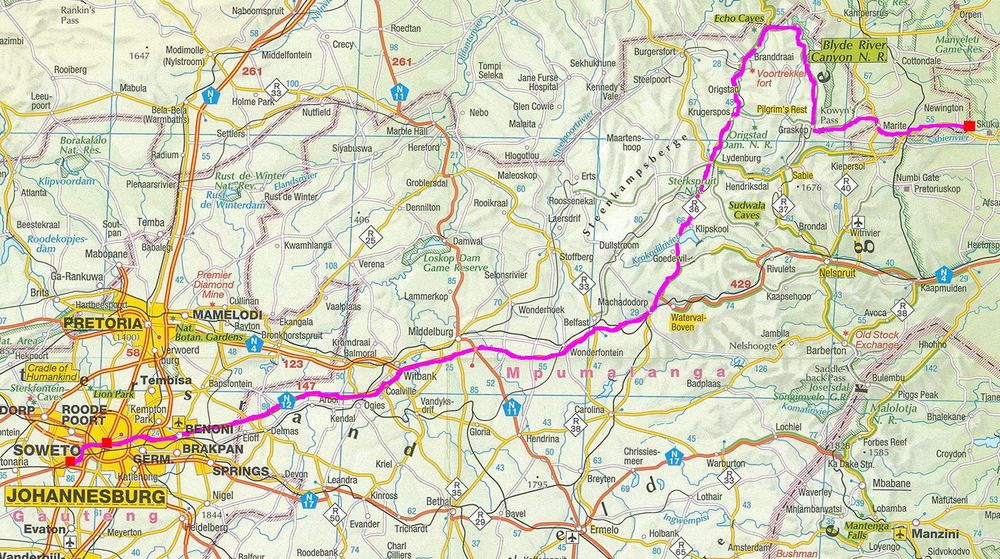Rześcy, ale z odleżynami, już przed 8.00 (12 godz. snu) ruszamy na zaplanowaną dzisiaj trasę. Jak najszybciej chcemy opuścić prowincję Gauteng (najważniejszy okręg przemysłowy RPA, „miejsce złota” w języku sesotho) oraz „E’Goli” („złote miasto” jak nazywają Johannesburg miejscowi). Mówiąc czulej…„Jozi”…słynąca z niepochlebnych opinii (rozboje, kradzieże – również z użyciem broni) to przede wszystkim kopalnie kruszcu, stanowiącego podstawę bogactwa całej prowincji. Ponieważ „Jozi” rozrasta się bardziej w poziomie niż w pionie, w związku z czym wyjazd z miasta „trochę” trwa. Wyjeżdżamy na wschód, drogą nr N12. Na jednej ze stacji paliw spotykamy parę motocyklistów z pobliskiego miasteczka, którzy dosiadają najnowsze, eksportowe wersje rosyjskiego Urala – oba z bocznym wózkiem. Choć do tej pory podróżowali GS-em BMW w wersji Adventure, to zachwalają ten sprzęt, ciesząc się wspaniałą zabawą (cena w RPA około 17tys. USD). Początkowy 150km odcinek, płaski, biegnący poprzez pola uprawne niezliczonej ilości farm, będący płatną autostradą (1 odcinek-45 rand, drugi-67 rand). Dopiero po przebyciu następnych 100 km, w okolicy miejscowości Machadodorp, kiedy odbiliśmy na północ w drogę nr R36, prowadzącą w kierunku Blyde River Canyon N.R., ukazały się w pierwszej kolejności „potholes”…ogromne dziury w asfalcie, a w drugiej…malownicze krajobrazy gór, przełomu rzeki Blyde. Apogeum tych widoków osiągnęliśmy, po odbiciu za miejscowością Branddraai, jadąc na płd.-wsch. w kierunku Graskop, gdzie w widokowym miejscu, jak na dłoni, w otoczeniu czerwonych skał, wciął się głęboko meandrujący kanion. Przejeżdżamy przez urokliwy rejon , licznych wodospadów, wspaniałych gór i urwisk, a położone jest to wszystko, jak mówi reklama, przy jednej z najładniejszych tras panoramicznych na świecie. Droga ta znajduje się w północnej części Gór Smoczych i jest obowiązkowym punktem podczas zwiedzania RPA (z zaleceniem…bez pośpiechu) Ciekawostką tego rejonu są występujące tuż obok siebie plantacje sosny, eukaliptusów i bananowców. Nasza dzisiejsza droga zakończyła się przed bramą Paul Kruger Gate do Parku Narodowego Krugera- Kruger N.P. Mieliśmy zamiar dotrzeć do obozowiska Skukuza i tam zanocować, jednak park zamykają o zmroku, co obecnie odpowiada godz.18.30, więc i nam zamknęła się droga i zarządziliśmy odwrót. Kilka km od bramy, znaleźliśmy Guest House „Kruger Gate”, prowadzony przez czarnoskórego anglika i jego białą żonę, wynajęliśmy pokój za 600 rand (śniadanie płatne 100 rand). Po przebyciu dzisiejszego dnia ponad 500km, padliśmy nieco skonani.