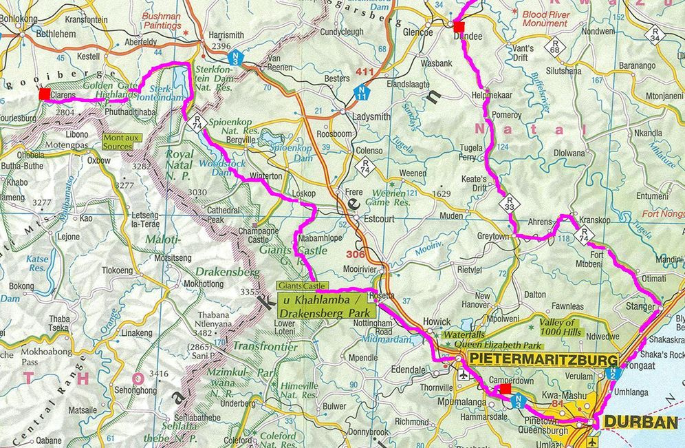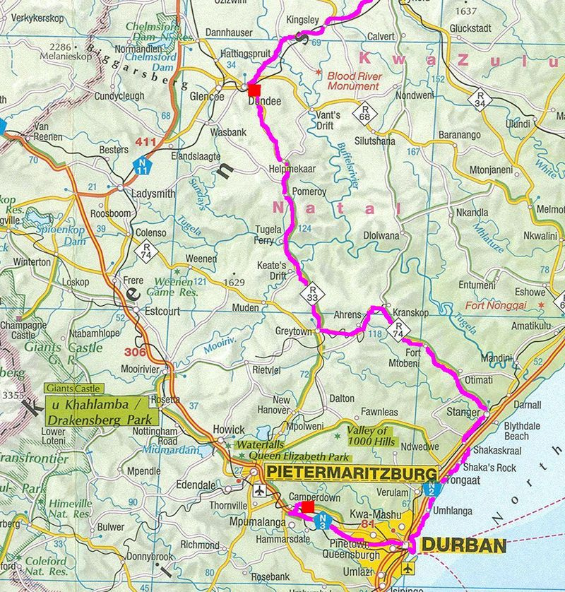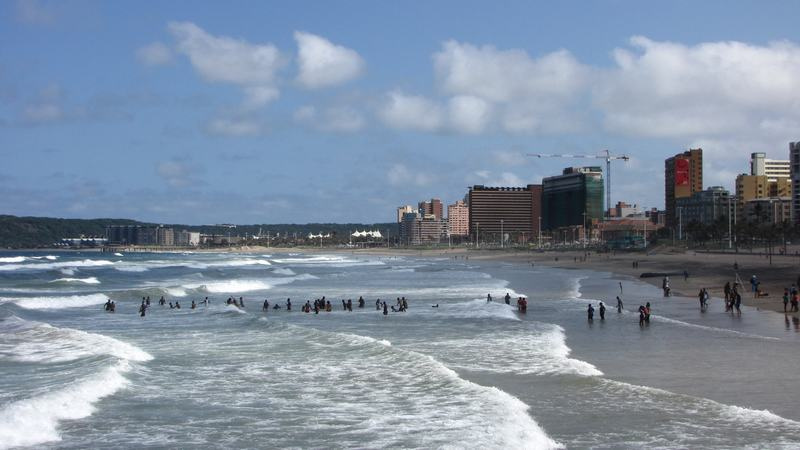 Nocą przeszła burza z nawałnicą opadów, a rankiem po wieczornym obżarstwie, dobrowolnie zrezygnowaliśmy ze śniadania (co w moim przypadku jest anomalią). Ruszając prosto na trasę, przemieszczamy się nadal widokową drogą nr R33, na południe w kierunku portu Durban. Ponownie potężne plantacje i farmy sięgające po horyzont, a wyżej w górach siedliska czarnych mieszkańców rozproszone na górskich zboczach, tuż przy drodze wiele kolorowych targowisk, wałęsających się osłów i uroczych okrągłych domków krytych trawą, gdzie każdy jest w posiadaniu odrębnego stanowiska silnej potrzeby. Po przebyciu 130km w miejscowości Greytown, skręcamy w drogę nr R74, aby po następnych 110km dotrzeć do Stanger, miasta leżącego już nad Oceanem Indyjskim (przemysłowe miasto, przetwórstwo trzciny cukrowej, w przeszłości siedziba króla Zulusów- Czaki). Stamtąd nadoceanicznym brzegiem docieramy do portu Durban, który jest najpopularniejszym miastem wypoczynkowym, potężnym ośrodkiem turystycznym, z atrakcyjnymi plażami i zapleczem hotelowym. Choć, jak nam powiedziano ustalając cenę za pokój, że to pełnia sezonu, jakoś ani wylegających tłumów turystów, ani uroku miejsca…nie widzimy. Plaże wprawdzie już bez napisów „Tylko dla białych”(zniknęły w latach 90-tych), budynki hotelowe prawdopodobnie projektował ktoś z upodobaniem klocków, jadłodajnie na plaży mocno zużyte i podają fast food (Steers, Spur) i stragany rzędem (każdy posiada tę samą kolekcję giftów).