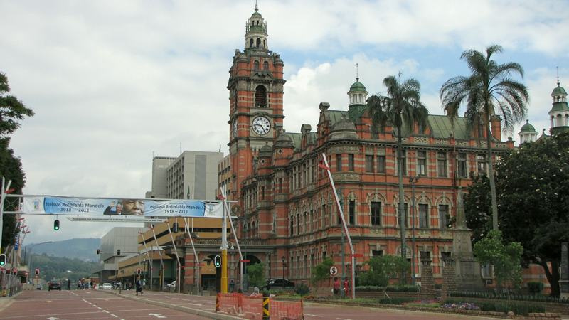 Rankiem, a dokładnie od 5.00, tuż obok naszego okrąglaka, ale za ogrodzeniem, wydzierał się lew, jakby to powiedziała moja babcia „japa mu się nie zawierała”. Miejsce w którym nocowaliśmy, przeżyło już swoje chwile świetności wiele lat temu. Obecnie podupada z zupełnie prozaicznej przyczyny… z braku turystów. We wszystkich miejscach, gdzie do chwili obecnej nocowaliśmy, byliśmy albo jedynymi, albo jedynymi turystami zewnętrznymi. Ruszamy po obfitym śniadaniu (kiełbaski, jajka sadzone, pieczona papryka z cebulką i pieczarkami, bekon podsmażony, tosty, dżemy oraz płatki śniadaniowe z mlekiem– tutejsza wersja śniadaniowa jest chyba najbogatsza jaką znamy na świecie). Już po kilku kilometrach, jadąc na północ autostradą nr N3 docieramy do mocno reklamowanego, wiktoriańskiego miasta Pietermaritzburg. Miasto pretenduje do miana jednego z najlepiej zachowanych wiktoriańskich osiedli na świecie, rzeczywiście bogato zdobiony ceglany ratusz robi wrażenie, kilka innych jest godnych uwagi, natomiast pozostałe budowle…mocno nadużyto tutaj słowa wiktoriańskie. Miejscem, które z pewnością zasługuje na chwilę postoju, jest wiktoriański dworzec kolejowy, ale nie ze względu na jego jakiś wyjątkowy wygląd, czy atrakcyjne miejsce, bo tak nie jest, lecz na sytuację która kiedyś sprowokowała do działań pewnego młodego hinduskiego prawnika.