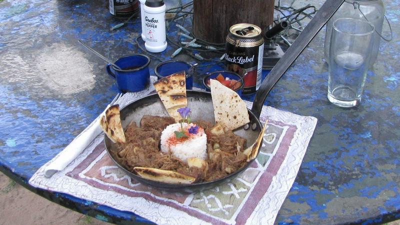 Teraz pozostało nam powrócić tą samą drogą do miejscowości Aus i na tamtejszym kempingu zatrzymać się na dzisiejszą noc (150 N$ za stanowisko dla nas i naszego pojazdu). Korzystając z usług miejscowej restauracji, nie odmówiliśmy sobie 500 g. steka T-bone, oczywiście zjadamy go na połowę, gdyż taka porcja mięsa, to raczej oferta dla młodego drwala lub górnika przodowego.