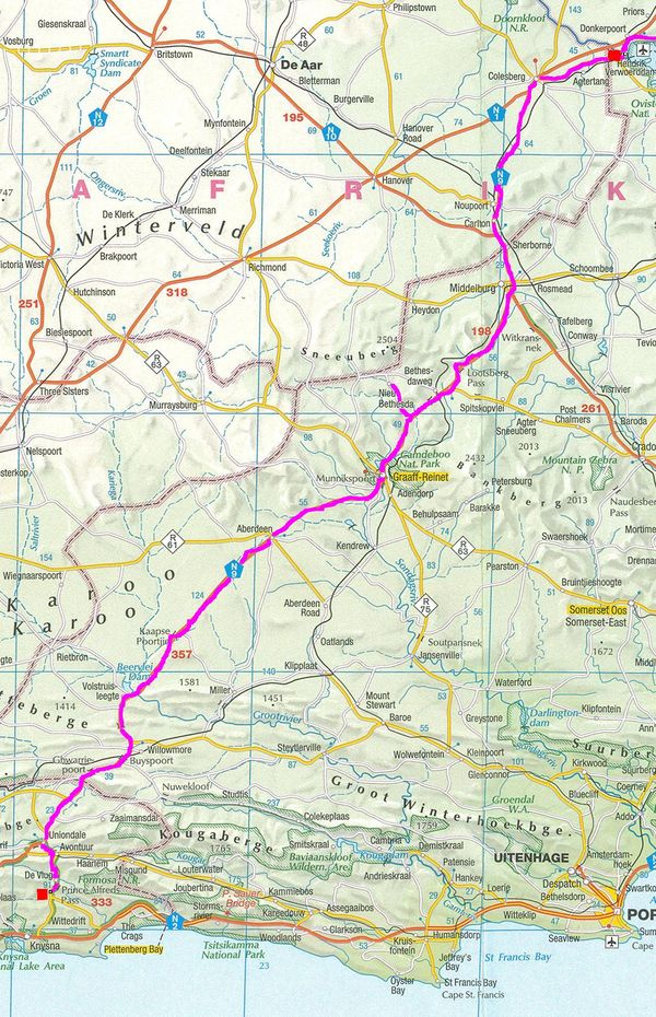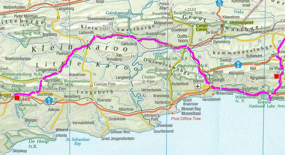 Następnym miejscem na trasie było miasto Graaff-Reinet, jak piszą… prawdziwa perełka Karru (region), gdzie do tej pory przy głównej ulicy zachowało się wiele budowli w stylu holendersko-przylądkowym oraz pięknie utrzymana świątynia Holenderskiego Kościoła Reformowanego( po prostu cudny). Dalej przemieszczamy się N9 do Uniondale, gdzie zbaczamy z trasy, aby przebić się przez nadmorskie pasmo gór, widokową, szutrową drogą prowadzącą do miejscowości Knysna. Lecz w połowie drogi zastaje nas zmrok i cóż począć?, natrafiamy na prywatny camp Angies G Spot (dość specyficzny), wynajmujemy spartańskie lokum na dzisiejszą noc za 350 rand. Nie ma prądu (nigdy nie było), w pakiecie lampy naftowe i świecące słoiki (ładowane energią słoneczną), drewniana toaleta na wysokości. Lekko wstawiona gospodyni, przygotowała nam potrawę z antylopy, którą jej mąż myśliwy i zarazem motocyklista, upolował w górach. Dojechał tu jeszcze Afrykaner, motocyklista o imieniu Franko, a wieczorna biesiada trwała dość krótko (wszyscy tak szybko pochłaniali alkohol).