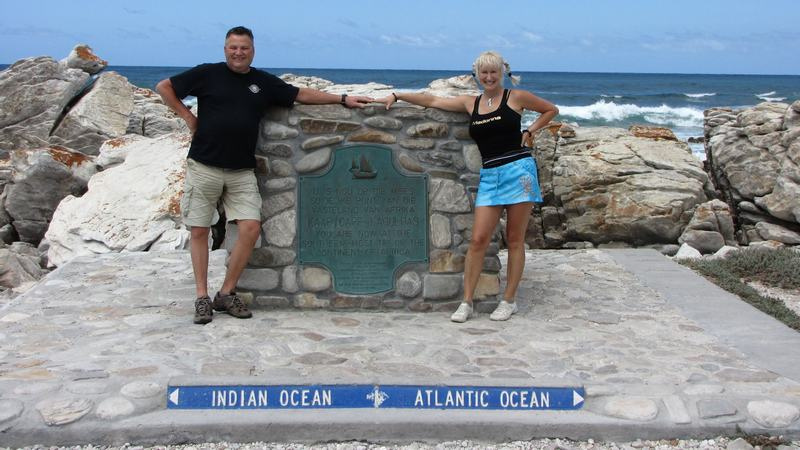 Rano szybki dojazd drogą nr R319, prowadzącą z Swellendam na południe, do najdalej wysuniętego punktu kontynentu afrykańskiego, Cape Agulhas (Przylądek Igielny)… to tutaj kończy się Afryka.. Na kilka kilometrów przed celem podziwiamy wspaniałe plaże po wschodniej stronie przylądka, leżące jeszcze nad Oceanem Indyjskim. Dziwnie pusto, jak na tę porę roku i czas weekendu, a miejsce, można powiedzieć wymarzone do plażowania. Baza noclegowa, wydaje się być nieograniczona, cały czas zadajemy sobie pytanie, dlaczego na całej naszej dotychczasowej trasie przejazdu tak mało turystów?, a w miejscach typowo kurortowych brak wczasowiczów? Czy coś jest na rzeczy?, czy to tylko przypadek?. Docieramy po przebyciu 120km od ostatniej bazy noclegowej, do przylądka gdzie geograficznie stykają się dwa oceany, od wschodu indyjski, od zachodu atlantycki. Punkt ten nosi nazwę Przylądka Igielnego… tak sobie myśleliśmy, że nazwa pochodzi od wystających skał w kształcie igieł, okazało się jednak, że to portugalscy żeglarze w XVIw nazwali to miejsce od igły kompasu, która dokładnie wskazywała północ.