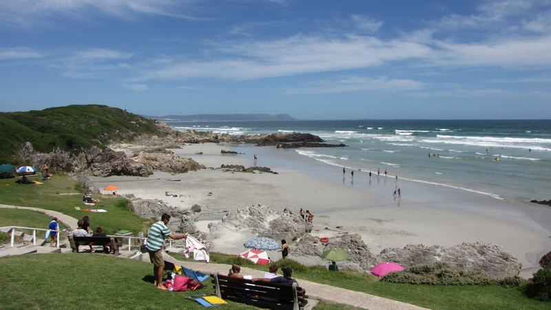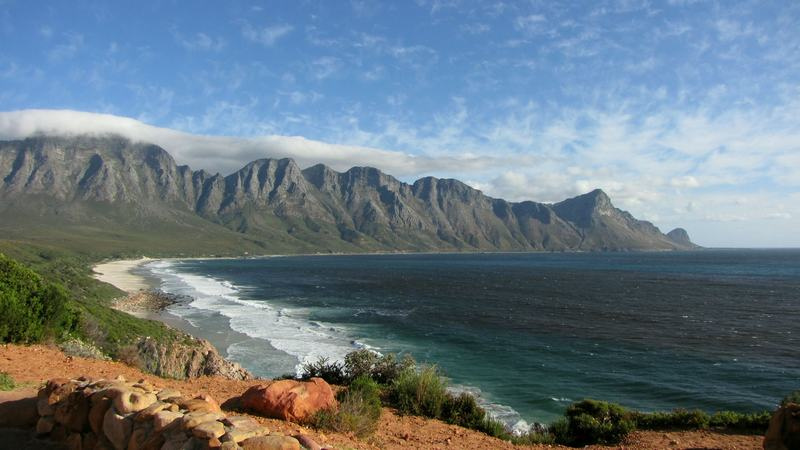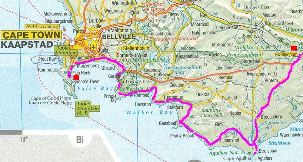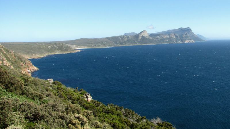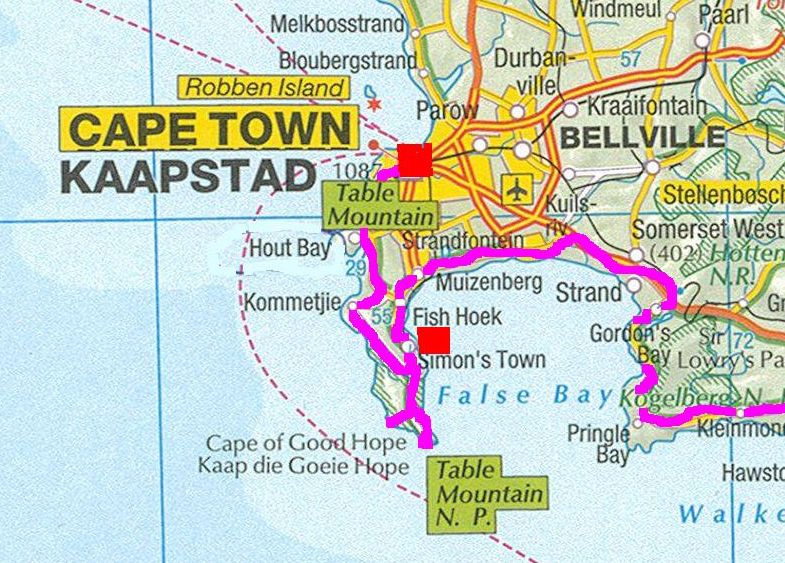Dalej już brzegiem Atlantyku przemieszczamy się drogą nr R43 na zachód w stronę następnego przylądka, noszącego nazwę Cape of Good Hope (Przylądek Dobrej Nadziei). Pierwszy odcinek aż do Gans Baai, przebyliśmy szutrowymi drogami w towarzystwie strusi i antylop. Natomiast od tego portu, droga nosi nazwę trasy wielorybników. W Zatoce Walkera pojawiają się wieloryby biskajskie południowe, objęte ochroną w najsurowszej wersji. W Hermanus docieramy do plaż, które tchną życiem i wreszcie widzimy, że pełnia tutejszego lata nadaje wczasowy ton i wygląda kurortowo. Ponadto miejscowość jest niezwykle urokliwa, z wieloma ciekawymi budynkami nakrytymi perfekcyjnie trzcinowymi dachami… jak na tą chwilę Hermanus otrzymuje pierwsze miejsce… za oblicze, wizerunek i solidne piękno. Następnie wkraczamy do Kogelberg National Rezerwat i docieramy do Pringle Bay, następnego przysadka będącego wschodnią rogatką wejścia do zatoki False Bay (Fałszywej Zatoki). Wspaniałe krajobrazy, toń oceanu, pełna gama kolorów przyrody i w tle góry o zaokrąglonych kształtach, a do tego kilka domów… coś jakby schrony, ale nie te z kategorii… przeciwatomowe. Teraz pozostało nam objechać całą zatokę, aby przedostać się na druga stronę do Przylądka Dobrej Nadziei. Niby widać go w niezbyt dalekiej odległości, ale do przebycia jest następne 120km.