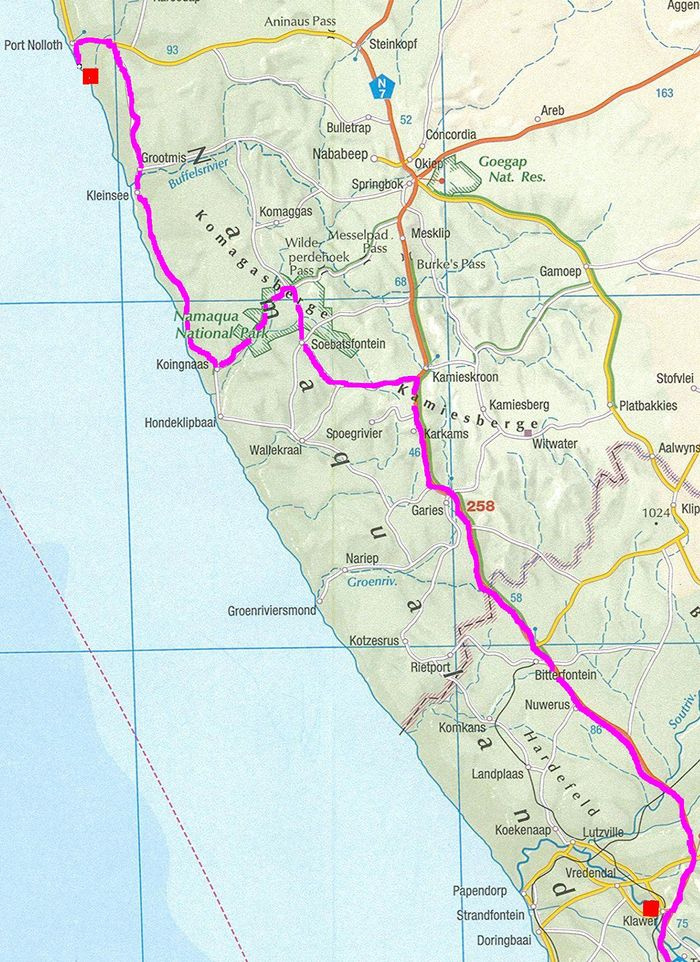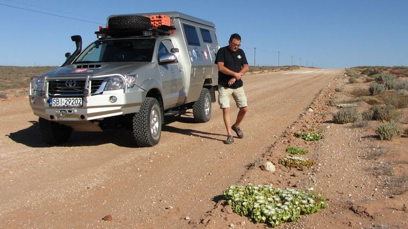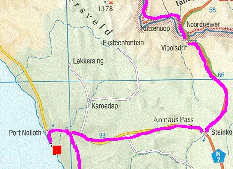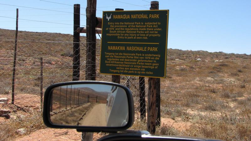 Kemping okazał się być małym zwierzyńcem, w którym dominowały oswojone springboki, jedyna uciążliwość to… nalepki pod butami. Ruszamy na trasę, kontynuując jazdę na północ drogą N7 (remontu cd.) Jedziemy nieco bezludnymi terenami, gdzie sporadycznie pojawiają się skromne zabudowania farm. Temp. 38Cº, czyli mamy słoneczne lato w porze deszczowej. Przejeżdżamy miejscowość Garies i po przebyciu 230km w Kamieskroon, odbijamy na zachód w kierunku Atlantyku, aby poprzez Soebatsfontein dotrzeć do Namaqua National Park.