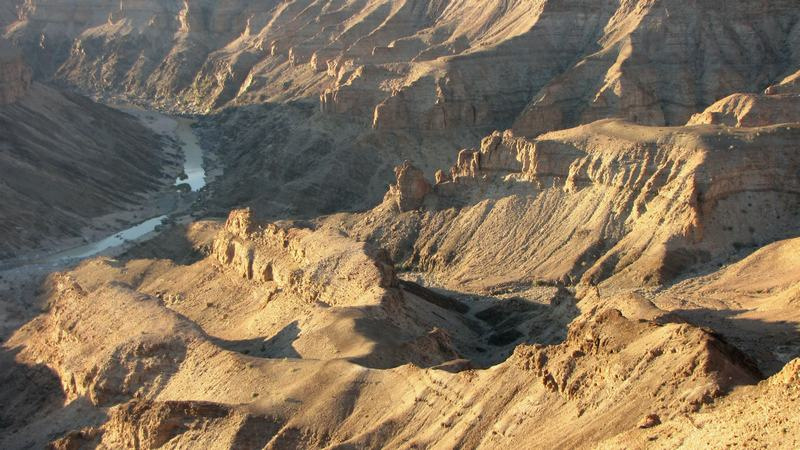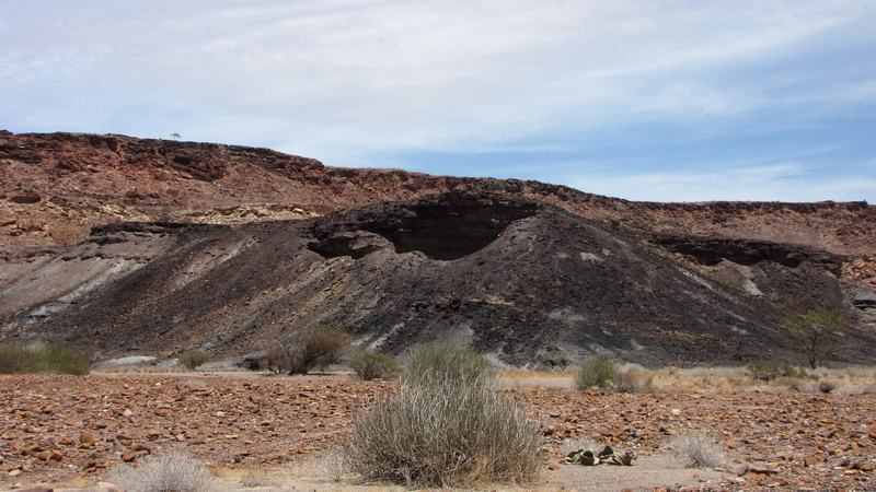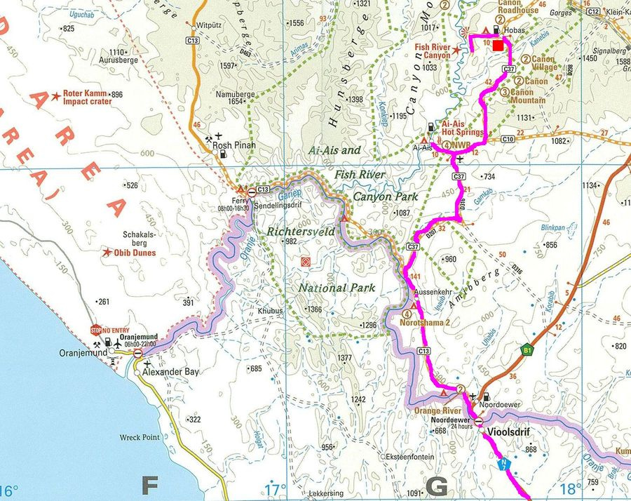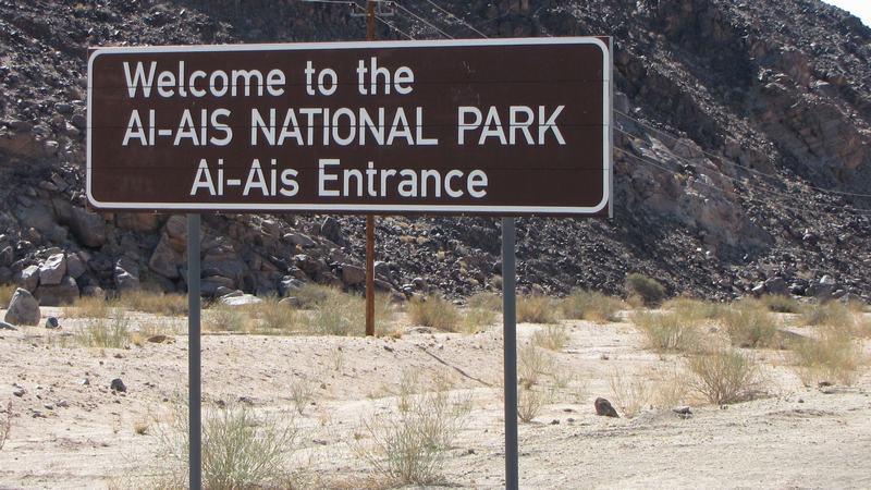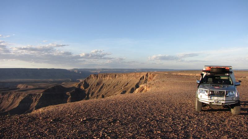 Zaraz po opuszczeniu granicy kończy się asfalt, a my jedziemy w kierunku pierwszej atrakcji tego kraju, Fish River Canyon. Ponieważ nie posiadamy przewodnika (edycja w języku polskim nie dostępna na rynku), tak więc o wszystko musimy pytać na trasie miejscowych. Najpierw drogą C13, wzdłuż granicy z RPA, brzegami rzeki Gariep, następnie drogami D278 i D316 do osady Ai-Ais, gdzie wokół tutejszych gorących źródeł utworzono luksusowy kompleks SPA Ai-Ais Hot Springs, zaczynając od temp. wody 30ºC, kończąc na 65ºC . Jakoś nie przekonali nas do kąpieli przy temperaturze na zewnątrz 46ºC… w takich okolicznościach, można się tylko ugotować. Opuszczamy to „wrzące” miejsce i jedziemy dalej wzdłuż Fish River Canyon na północ, w kierunku następnej osady, bazy turystycznej Hobas, z której to do najlepszego punktu widokowego na kanion, jest tylko 10km. Co widzieliśmy po drodze? Najpierw bardzo starannie zasadzoną winorośl w rozległych ilościach, później po szutrze w wersji rollercoaster mnóstwo domków ze słomy, nieco dalej totalne nic (marsjański krajobraz), a dalej to już tylko wszystkie odcienie szarości, ciut brązu, żółci, odrobina suchego zielonego i siwe drągi z wyrostkami (tutejsze drzewo quivertree). Wstęp do parku po 80 N$ od os. + 10 N$ za pojazd. Mamy dobry czas, więc zostajemy w tym niezwykle urokliwym miejscu aż do zachodu słońca (19:40). Po powrocie, na rogatkach parku, w obrębie bramy wjazdowej usytuowany jest kemping, więc korzystamy i wynajmujemy stanowisko wyposażone w grill i stoliki za 240 N$. Zachód słońca powoduje ulgę termiczną, gdyż temp. spada do 30ºC, co przy włączonych wentylatorkach, dość komfortowo pozwala przespać noc.