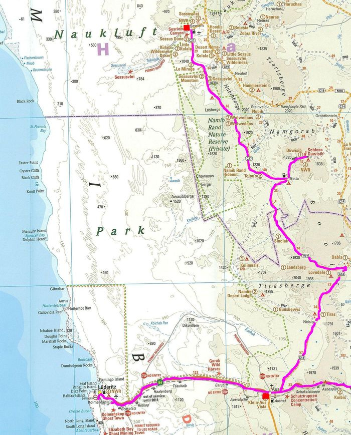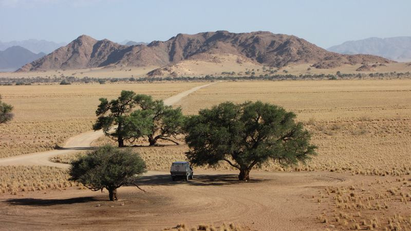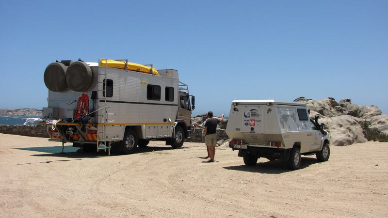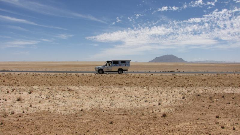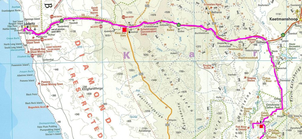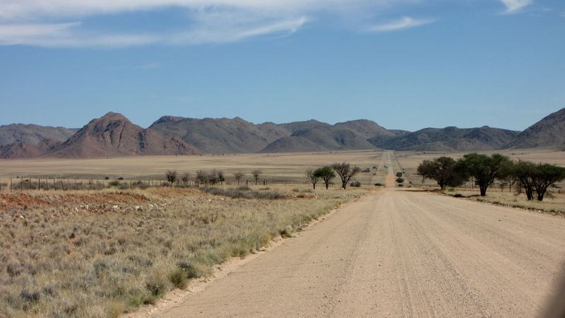 Ruszamy rankiem z naszego kempingu, gdzie po raz pierwszy napotykamy na turystów podobnych nam. Kilku Afrykanerów, zorganizowane grupy podróżujące specjalnie przystosowanymi ciężarówkami, są też europejczycy, para niemieckich turystów podróżująca od pięciu miesięcy po RPA i Namibii ciężarowym Mercedesem z kontenerem mieszkalnym. Jedziemy z Hobas na północ do Seeheim drogami C37 i C12, a następnie odbijamy w kierunku Atlantyku, drogą B4 prowadzącą do portu Lüderitz. Przemierzamy półpustyne tereny, czyli totalne nic cd., dominujące trzy kolory: czarny, żółty i niebieski, strusiowe grupy, fatamorgana powoduje, że samochody z naprzeciwka wyglądają jak amfibie płynące wprost na nasz blaszany okręt.