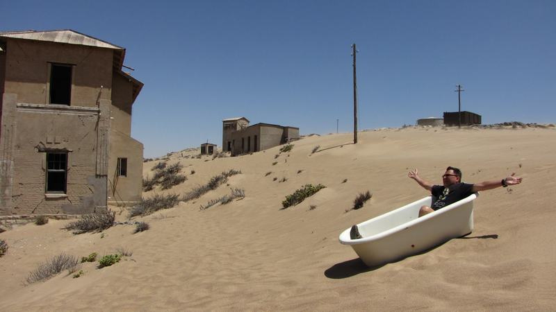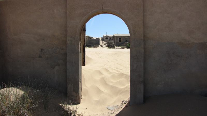 Wzdłuż drogi ciągną się tory, nic nie jedzie, jakby były donikąd, tylko strusie czekają przy nich z nadzieją, że jednak coś przejedzie, tylko co? Widzianym obrazom, farby ukradły podstawowe kolory, jest tylko wyblakły niebieski, zużyty szary, przeterminowana zieleń, utleniony pomarańczowy i spacerujący piasek, powietrze zagęszczone pyłem, oznak życia brak, gdyby nie słupy energetyczne… byłaby to planeta Mars. Za miejscowością Aus, wkraczamy w nadatlantycki pustynny pas, zdominowany zimnymi prądami i bardzo wietrzną aurą. Po zwiedzeniu portu i przylądka prowadzącego do „Shark Islands”-„Wyspy Rekinów”, gdzie skały przypominają pomiętą plastelinę, jedziemy do opuszczonej osady Kolmanskop, miasteczko rozwinęło się po odkryciu diamentów w 1908, zasiedlili je górnicy z pobliskich kopalni, zbudowane zostało w stylu niemieckim. Posiadało szpital, elektrownię, szkołę, teatr, halę sportową, kasyno oraz linię kolejową do Lüderitz. Zaczęło upadać po I wojnie światowej, gdy spadły ceny diamentów. Opuszczone zostało w 1956. Obecnie zasypane piaskiem, zdecydowanie wkraczających tu wydm, zwane „Miastem Duchów” („Ghost Town”). Smagani wiatrem, w piaszczystej zamieci, zwiedzamy to zapiaszczone miejsce, gdzie niegdyś świetnie funkcjonował diamentowy interes. Budynki, od lat opuszczone, wieją grozą i pozostawiają pole do zadumy, to obecnie rzeczywiście wspaniałe miejsce dla duchów tamtych czasów. Nie znajdziemy słów właściwie dopiaszczonych, by opisać co wyprawia spółka z nieograniczoną pazernością wiatrowski&piasecki, robi swoje i nie przestaje.