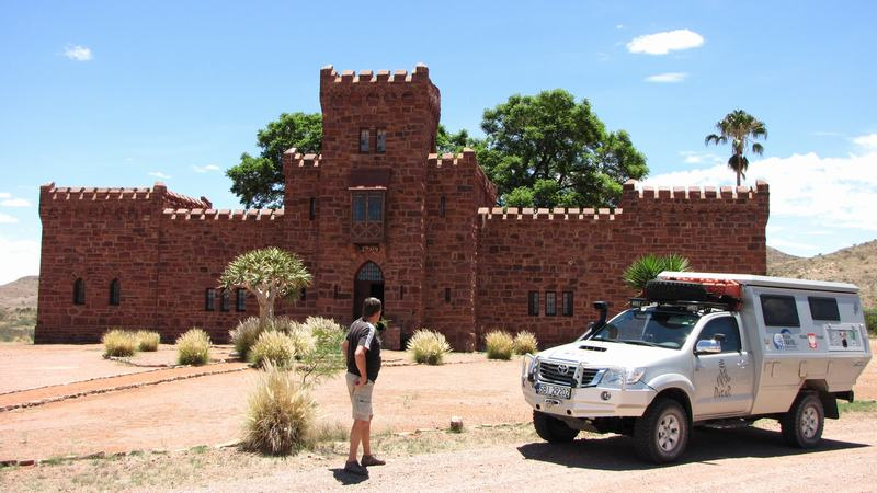 Rankiem, zastanawiamy się jakie zioło jedzą miejscowe krowy, bo po wczorajszej kolacji, Wojtek brał udział w działaniach wojennych, a ja szykowałam się do odejścia w trzeci wymiar, nawet ubranie pamiętam, jak misternie dopasowywałam do koloru koronek… eh co za traumatyczne wizje. Z Aus ruszamy na północ, żegnamy się na kilka dni z asfaltem i najpierw drogą C13, a następnie po 208km drogą C27, jedziemy do osady Betta (farma, stacja paliw i mini bar z kempingiem). Stąd jedziemy 20km do miejsca jakim jest zamek Duwisib Castle (60 rand od os.), wybudowany w 1909r przez niemieckiego barona Von Wolf. Dziwna wizja i dość duża niezależność umysłowa, by postawić tu coś takiego. Jedno co trzeba przyznać, przy panującej na zewnątrz temperaturze bliskiej 40ºC, w przestronnych wnętrzach, dość spartańsko wyposażonych jak na zamek, jest wyjątkowo chłodno. Mimo wszystko nic ciekawego.