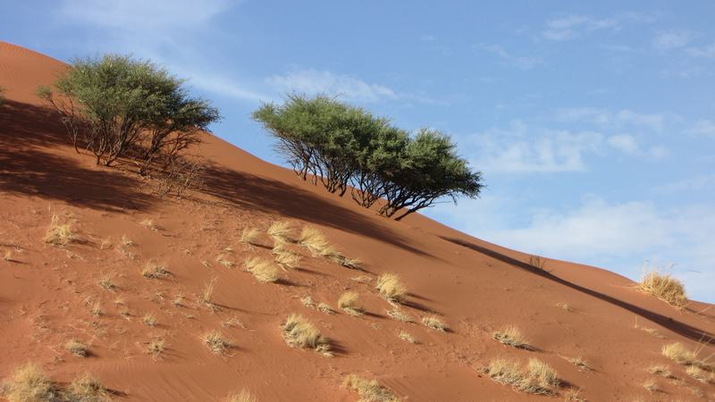 Jeszcze wczoraj mieliśmy dylemat czy natychmiast jechać do parku, czy czekać do dzisiejszego poranka? Rozwiała nam te myśli obsługa campu, twierdząc, że widoki są zdecydowanie ciekawsze o wschodzie słońca, niż o jego zachodzie. Ponieważ do centralnej części parku jest 65km i należy z niego powrócić, postanowiliśmy, że jedziemy tam o świcie, co uczyniliśmy, zrywając się już o 6.30. Rześki poranek, doskonała widoczność, niebo jak malowane i te niepowtarzalne kolory w tonacji pomarańczy. Ostatni, 5km odcinek, prowadzący przez piaszczyste wydmy, dostępny jest jedynie dla pojazdów 4×4, co nie uchroniło co niektórych, od pozostania po osie w piasku. Rzeźbiony, zardzewiały pomarańcz jest wszędzie, a na nim „zmartwione”, suche drzewa, paski śladów opon, wiją się jakby donikąd… końca nie widać. Nie od rzeczy są wpisy na Światową Listę UNESCO.