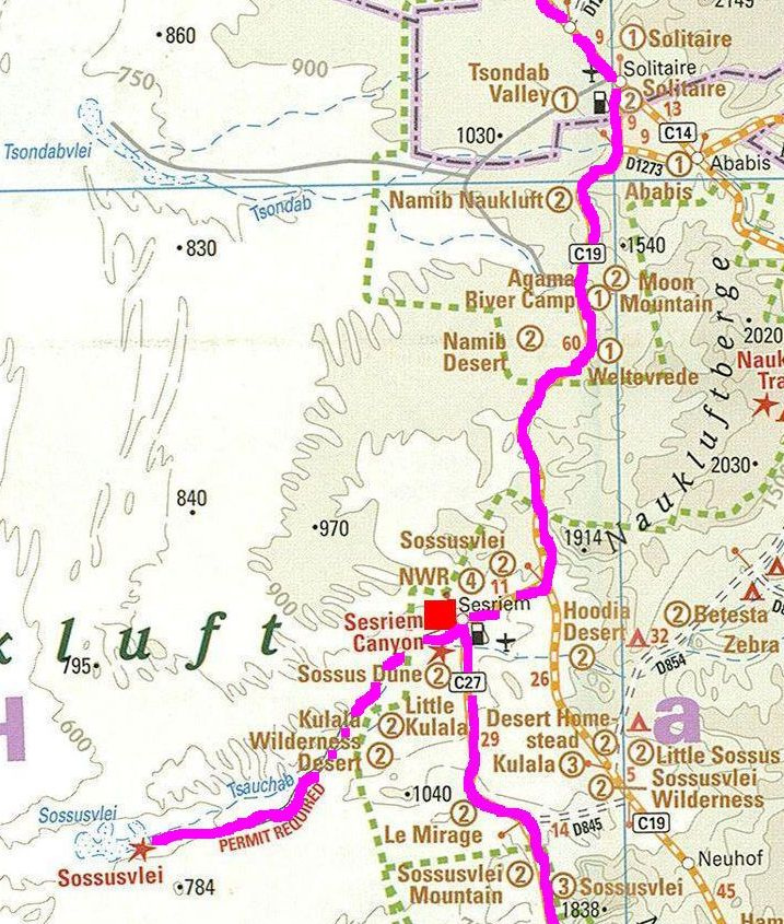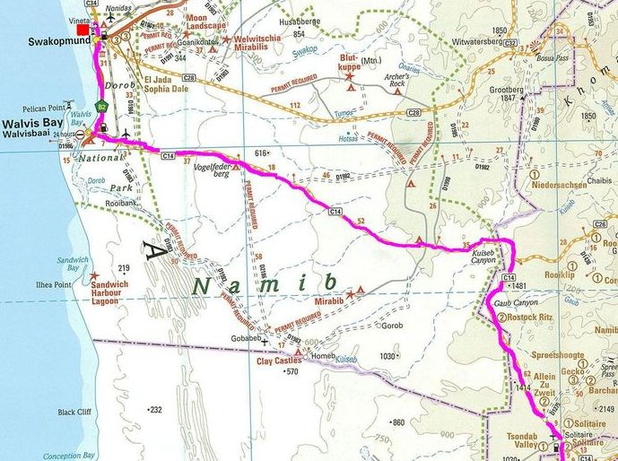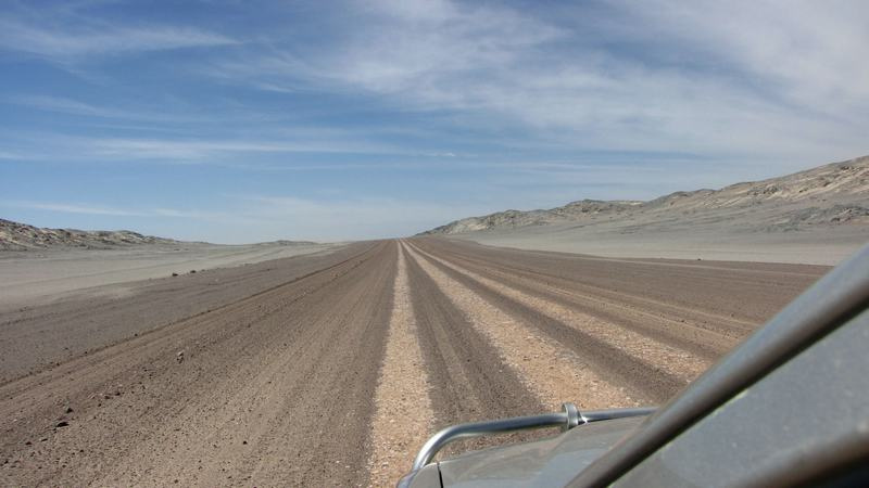 Po powrocie do bazy, jaką był camp w Sesriem, dalsza trasa to 320km przejazd do Walvis Bay, położonego nad Atlantykiem. W zasadzie nudna i monotonna szutrowa trasa przebiegająca drogami C19, a od miejscowości Solitarie C14, o niezbyt dobrej, staropralkowej nawierzchni.