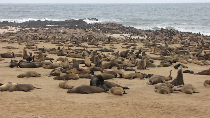 Z pewnością najciekawszym miejscem, poza wrakami okrętów, którym mgła zakończyła żywot i zalegają obecnie na plażach, było odwiedzenie Cape Cross, gdzie w „Seal Colony” po wykupieniu biletu (segregacja: my, europejczycy płacimy po 80N$ od os., RPA-60, a tubylcy-30), zastajemy wrzeszczący tłum tysięcy fok, które akurat o tym czasie, mają okres wylęgu. Spacerowanie pomiędzy nimi ma pewien mankament… czy jest stopień wyższy od słowa smród?… po dość krótkim czasie zaczynamy odczuwać efekt… uwaga! śniadanie powraca… robimy odwrót i… jedziemy dalej, by po następnych 67km wkroczyć na teren następnego Parku Narodowego „Skeleton Coast N.P.”. Wjazd jak na granicę następnego państwa, wpis i bez opłat jedziemy dalej (ważnym jest, że przejście to jest czynne do rana tylko do godz 17.00 i do tego czasu, należy tę rozległą strefę opuścić).