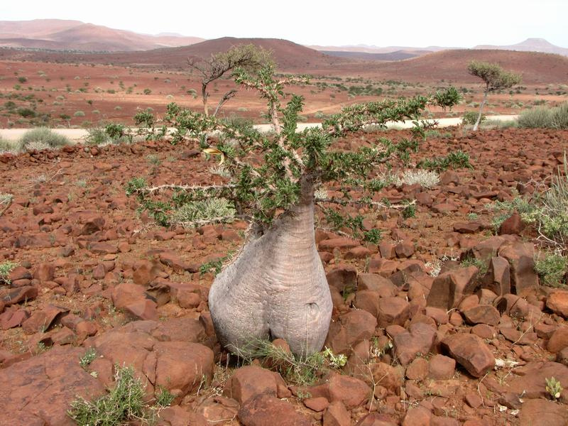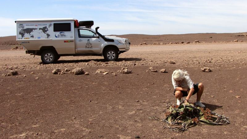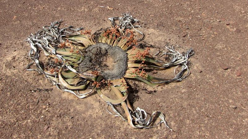 Ale jak tu gnać, jak wokół jest tak czarująco, a do tego spotkaliśmy wreszcie narodowy symbol Namibii, roślinę (na fotografii, to takie brzydkie z siwymi wąsami) – Welwitschie Mirabilis (welwiczja przedziwna), osobliwy gatunek endemicznej rośliny pustynnej. Występuje jedynie na kamienistych równinach północnej Namibii i południowej Angoli, oraz ciągnące się wzdłuż wybrzeża Oceanu Atlantyckiego (pustynia Namib, Kaokoland). Roślina opisywana jest jako jedna z najdziwniejszych znanych i występujących współcześnie na Ziemi. Gruby i krótki pień, w zdecydowanej większości schowany pod ziemią, osiąga ponad powierzchnię do 50 cm wys. i 120 cm średnicy, rozszerzający się ku górze. Z niego wyrastają tylko dwa skórzaste liście, mogące osiągać ogromne rozmiary nawet do 6 m, z czego połowa powierzchni liścia może być wciąż żywa, bo reszta pęka na podłużne pasy i jest zasuszona. Liście welwiczji żyją najdłużej ze wszystkich liści roślin – nigdy nie zrzucane żyją wraz z całą rośliną kilkaset lat i służą im do magazynowania zapasów węgla w sprzyjających warunkach, który pozwala im przeżyć długie okresy suszy. Rośliny potrafią wegetować wiele miesięcy bez dostępu do wody, absorbując wodę z mgieł. Kwiaty męskie i żeńskie występują na osobnych roślinach. Pomimo, że welwiczja nie jest dużym drzewem, może poszczycić się bardzo dobrze rozbudowanym systemem korzeniowym sięgającym na głębokość 30 m i szerokość kilkunastu metrów. Nasiona roznosi wiatr, a żywotność zachowują co najmniej 2000 lat. Nazwa upamiętnia austriackiego botanika Friedricha Welwitscha (1806-1872), odkrywcę tej rośliny w roku 1859 na pustyni Namib.