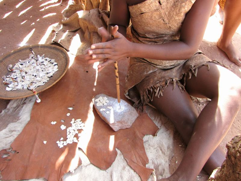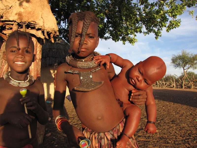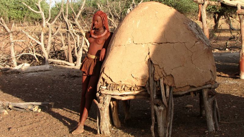 Do stóp wodza złożyliśmy dary, on wycenił to wzrokiem ostrym, ale z akceptacją… i już od teraz, wszystko stało się dla nas dostępne i możemy dosłownie wszędzie zajrzeć, robić zdjęcia i z pomocą językową Johna, dowiadywać się szczegółów z życia tej społeczności. Wioska licząca około 30 osób, to rodzina wodza, trzy żony i rodziny czterech jego synów. Ponieważ ludy te żyją w nieskalanych cywilizacją warunkach, nikt nie mówi po angielsku, więc nie ma najmniejszej możliwości porozumienia, jednak nasz John wywodzi się z tej społeczności więc… został mianowany translatorem. Trudno opisać to co widzimy i czujemy, ale takiej egzotyki i takiego folkloru, nie doświadczyliśmy jeszcze nigdy. Kobiety o nieprzeciętnej urodzie przyodziane są jedynie w kuse spódniczki z bordowej koziej skóry. Z wiekiem, kiedy walory młodości ustępują, skóra kobiet plemion Himba, wciąż pozostaje gładka jak jedwab… i od razu podajemy przepis na sekret pięknej skóry… należy pokryć ciało i włosy mazią robioną z tłuszczu mleka krowiego, ekstraktu z roślin, popiołu i ceglasto-czerwonej ochry – „otjize” (spróbowałam, ciężko się zmywa). Makijaż ma wyrazisty brunatno – czerwony kolor. Przyciąga uwagę (naszą przyciągnął na stałe), chroni przed insektami, słońcem i odwodnieniem organizmu oraz ma ewidentnie kosmetyczne walory utrzymujące skórę kobiecą w doskonałym stanie (kobiety zapakowały mi na wynos (do krowich rogów) sporo mazi i pachnidła, bym jak już wrócę do Polski, mogła napastować się, posypać ziołową perfumą i być wreszcie piękną… oj… chyba nie jest to bezpieczne posunięcie. Charakterystyczną cechą Himba są ich włosy, w czasie dojrzewania włosy dziewczynek plecione są do przodu, by zakryć twarz przed pożądliwymi spojrzeniami mężczyzn (zalotami). Kobiety, które osiągnęły już dojrzałość i są gotowe do zamążpójścia, wiążą włosy z tyłu głowy sznurkiem z palmy makalani. Kobiety zamężne noszą na czubku głowy skórzaną embrę. Natomiast wdowy zdejmują embrę z głowy na znak żałoby. Jednym z niebezpieczeństw dla plemienia Himba jest brak dostatecznej ilości wody. Często głodują, podczas przenoszenia swych domostw w inne bardziej żyzne i wilgotne tereny, których jest coraz mniej. Brak wody zmusza ich do utrzymywania higieny w dość niekonwencjonalny sposób… Himba myją się ziemią, a intymne części ciała… podkładają pod dym unoszący się z kadzideł… brzmi to ekstremalnie?… toteż tego już próbować nie chciałam…
