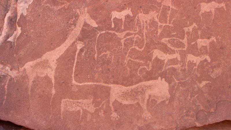 Następnie udajemy się do „Twyfelfontein Rock Engravings” (wstęp 60N$ od os.), gdzie przewodniczka Elizabeth, pokazuje nam w czasie 45 min. spaceru, mnóstwo wizerunków naskalnych sprzed 2-6 tys. lat, wykonanych przez Buszmenów, wędrujących nomadów, zajmujących się polowaniem na zwierzynę. W trakcie opowiadania, zadziwiły nas dwie informacje, pierwsza to, kogo należy się trzymać szukając wody w czasie suszy… ano żyrafy, ona musi pić codziennie i nie biega za szybko, bo to raczej „szybki, ale chodziarz”, druga to wyjaśnienie, po co te malowania zwierząt na skałach… bo to był ówczesny uniwersytet, Buszmeni zbierali się tam, malowali co gdzie zobaczyli, odprawiali rytuały i zapoznawali się łącząc w pary (wtedy portalem społecznościowym było rycie w skale… mocno okrojony przekaz i jak namalować „face”… ileż musiało być pomyłek i rozczarowań?… a może inaczej… wymagania były duuuużo skromniejsze?). Jest coś, na co szczególnie zwróciliśmy uwagę… dachy, elementy ogrodzenia, wykonanie toalet… to po prostu są dekle od beczek po ropie.