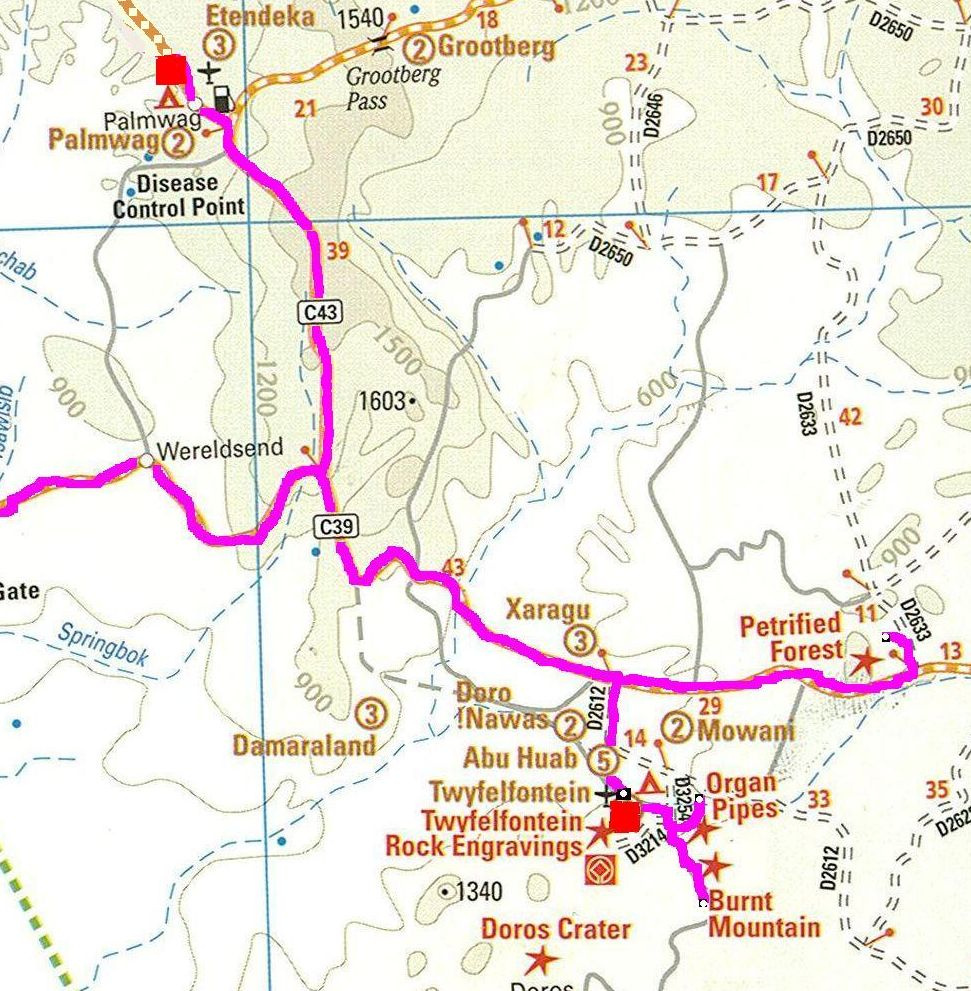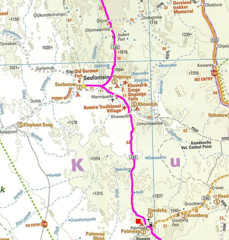 Następny na liście to „Petrified Forest” („Skamieniały Las”), (wstęp 50N$ od os.) i kolejny przewodnik oprowadza nas, by popatrzeć na powalone skamieniałe drzewa.Cały dzisiejszy dzień poświęcamy tym atrakcjom i dopiero późnym popołudniem, jadąc 120km na północ drogą nr C39, docieramy do osady Palmwag, gdzie czeka na nas, dziwna wewnątrzkrajowa granica, zamknięta na kłódkę. Tuż za nią, tankujemy na full, nie płacimy za paliwo na miejscu, tylko dostajemy kwit i mamy uiścić należność na campie, na którym zostajemy na dzisiejszy nocleg, „Palmwag Lodge & Campsite (240N$ za stanowisko). Doskonałe warunki, na kolację jak zwykle steki i w spokojnej atmosferze oazy, degustujemy inny rodzaj wina z RPA.