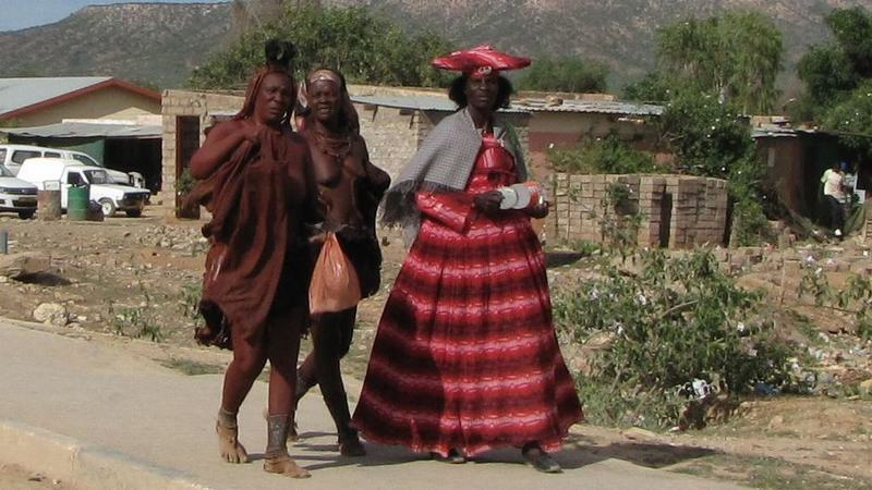 Docieramy do głównego miasta tego regionu Opuwo, gdzie w atmosferze wszechobecnego handlu i zamieszania, uzupełniamy zapasy, zakupujemy sugerowane prezenty w postaci żywności (mąka, cukier, ryż, makarony, cukierki dla dzieci), nie ukrywamy, że to zabiegi mające na celu pozyskanie przychylności wodza wioski Himba, dzisiejszy nocleg planujemy spędzić w jednej z nich, jeśli wódz da przyzwolenie. Mamy informację, aby spróbować, oddalając się od utartych szlaków, gdzieś kilkadziesiąt km na północ od Opuwo. Tymczasem w mieście podziwiamy kontrasty dwóch społeczności, Himba i Herero, różniących się zarówno wyglądem jak i zwyczajami, ale kiedyś żyjących tuż obok siebie, mówiących jednym językiem i prowadzących pasterski tryb życia. Przez pół wieku „zesłania” (Himba uciekli przed atakami innego plemienia, do Angoli), Herero pozostając, odpierali ataki, w międzyczasie poddając się wpływom kolonizatorów niemieckich, wtedy ich drogi rozeszły się całkowicie. Kiedy Himba żebrali o odstąpienie pastwisk w Angoli, Herero przejmowali od kolonizatorów niektóre zwyczaje, począwszy od rolnictwa osiadłego, po fasony ubiorów (dziś kobiety Herero noszą długie, obszerne, wzorzyste suknie i co najmniej dziwne nakrycia głowy, przypominające rogi krowy). Ci pierwsi pozostali zgodni ze starą tradycją, ci drudzy przejęli europejskie wartości.