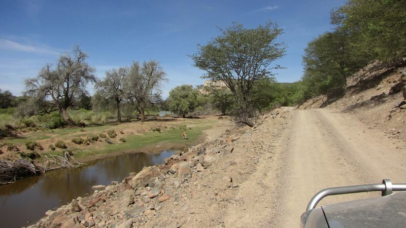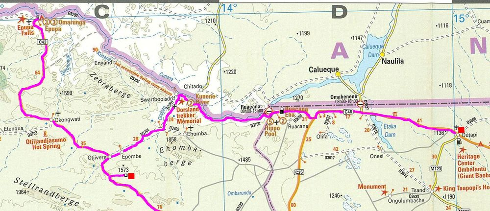 Niestety z powodu suszy w porze deszczowej, nie przedstawiają się w najwyższej krasie, ale miejsce jest niezwykle urokliwe, szczególnie widziane ze wzgórza, dominującego nad tą graniczną osadą (opłata 20N$ od os.). Teraz pozostaje nam przedostać się do trasy prowadzącej do Etosha National Park. Wybieramy północny przejazd, w związku z tym postanawiamy przedostać się do Ruacana, granicznego miasta z Angolą i początku asfaltowej trasy C46. Wybieramy polecaną przez poznanych na trasie podróżników z Belgii, drogę D3700 biegnącą na wschód, wzdłuż namibijsko-angolskiej granicy, brzegiem rzeki Kunene. Ponieważ jest susza, przejazd ten jest możliwy, a do tego niezwykle ciekawy. Jedziemy przez tereny, gdzie prawdopodobnie turysta jest pojawia się incydentalnie. Cały ten rejon zamieszkały jest przez plemiona Himba.
