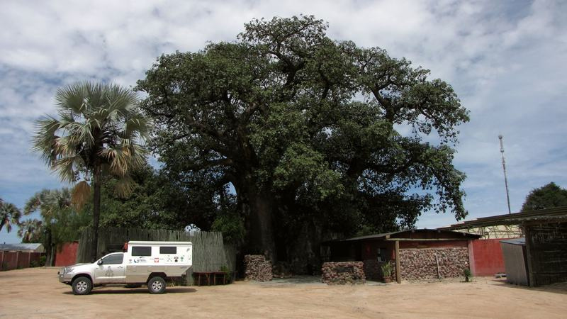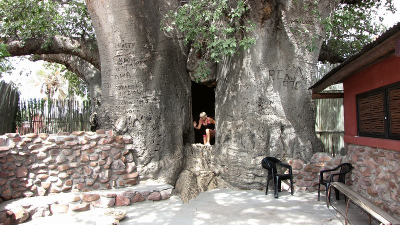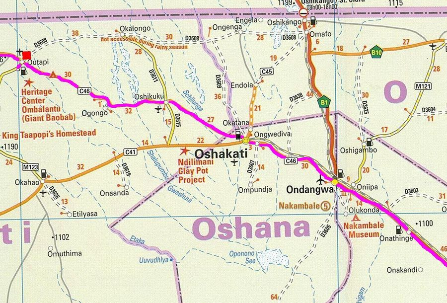 Wykorzystując warunki, nieco oporządzamy siebie i auto, toteż ruszamy na trasę nieco później. Jeszcze w Outapi, podjeżdżamy pod ogromy baobab – Ombalantu Baobab, liczący sobie około 1000lat (8.10m średnicy, 28m obwodu, 15m wysokości, gdyby tak 25 osób chwyciło się za ręce, to s w stanie go objąć). Jest drugim co do wielkości okazem w Afryce, a do tego z kapliczką w środku. Dalszy przejazd, to typowa „dojazdówka”. Najpierw kontynuując jazdę na wschód docieramy droga C46 do miejscowości Oshakati, gdzie tuż za nią zatrzymujemy się na targowisku Omuthiya Market, miejscowi sprzedają tu pieczone mięso, gotowaną kukurydzę, ziarno, warzywa, suszone mini rybki, robale i zioła.