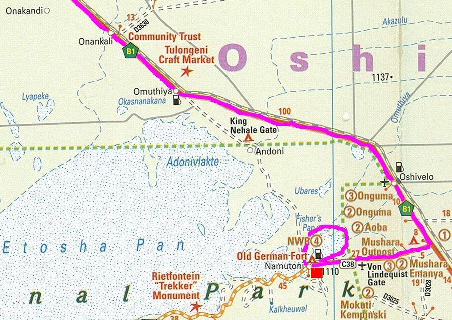 Następnie trasą B1, aż do Oshivelo, aby po następnych 18km odbić na zachód w drogę C38, prowadzącą do Etosha N.P. Wszystkie wymienione powyżej miasta, są zwyczajnie brzydkie. A co widzimy przy drodze?… niska zabudowa, złomowiska, śmieci i mnóstwo potłuczonych szklanych butelek usypanych w kupki, co do puszek po napojach obowiązuje ten sam system, do tego krowy, kozy, osły i zwyczajny bajzel… oj… zburzył nam się obraz Namibii… tej kosmicznej, porażającej pięknem… wraz z opuszczeniem Himbastanu… jest zwyczajnie.