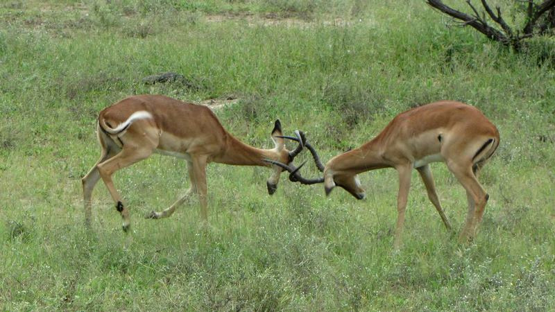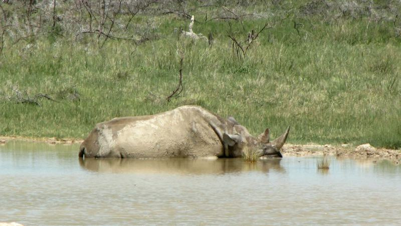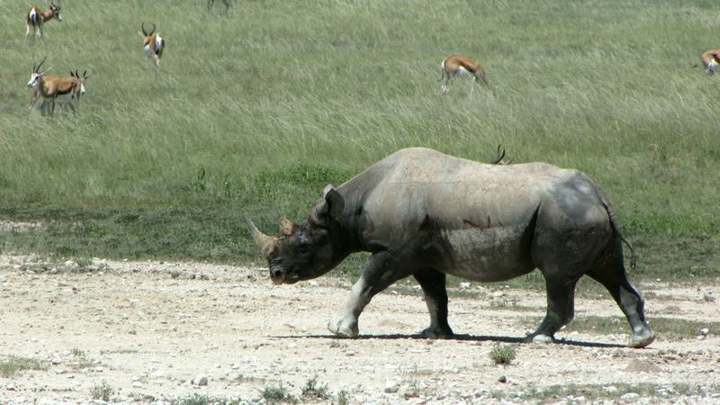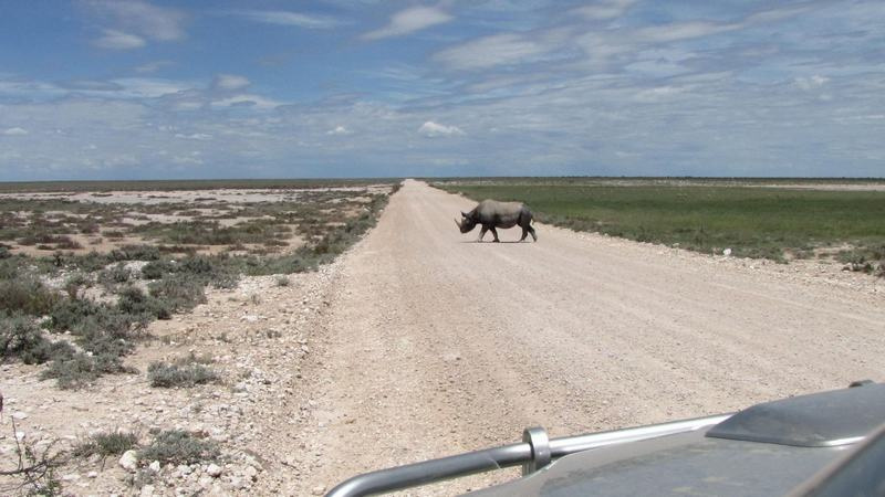Cały dzisiejszy dzień, to penetracja najciekawszych fragmentów, tego niezwykle rozległego parku narodowego. Pokonujemy ponad 350km po jego terenie, pomiędzy dwoma osadami ulokowanymi na jego krawędziach, od wschodu Namutoni, od zachodu Okaukuejo. Po terenie parku poruszamy się wyłącznie szutrowymi, dobrze utrzymanymi drogami. Większość z nich prowadzi do oznaczonych wodopojów, bajor i jeziorek, gdzie spotykamy największe zgrupowania zwierząt. Najbardziej interesujące spotkanie, mieliśmy jednak z czarnymi nosorożcami, zapalonymi w walce o dostęp do jednej z takich sadzawek, to był krwawy konflikt, poparty bojową postawą i charczącym rykiem, próby sił trwały ponad pół godziny, pokonany i poraniony musiał odejść. Nie będziemy więcej zamęczać opisami, niech fotki przekażą wrażenia, sytuacje i różnorodność zwierzyny, zdajemy sobie sprawę iż jest ich nadmiar, toteż mamy wielki dylemat, które opublikować, a które zostawić w magazynie.