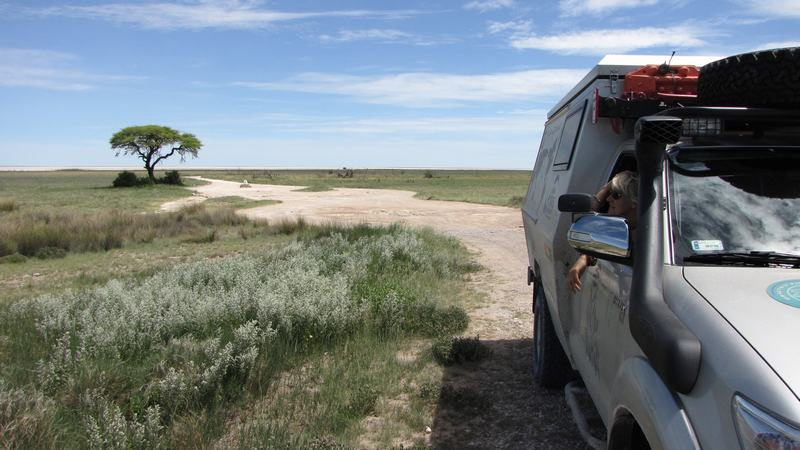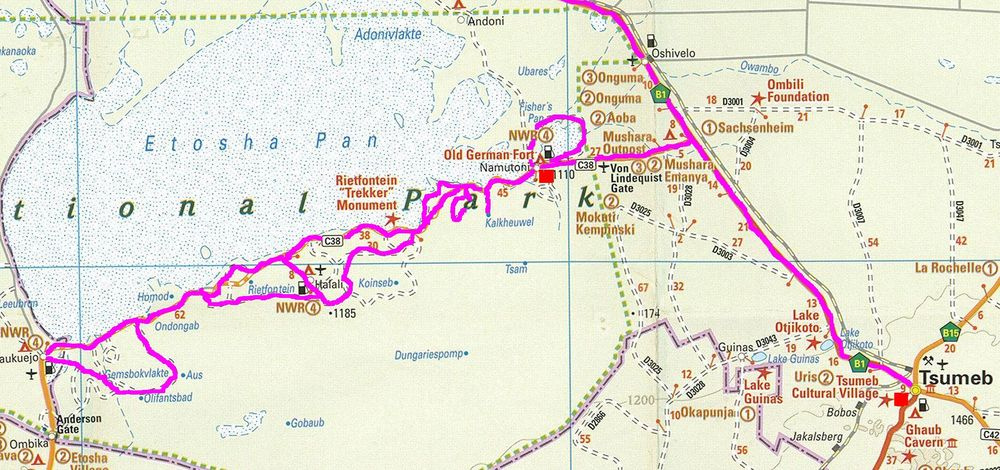 Przekraczamy bramę parku i w osadzie Namutoni, znajdujemy dzisiejszą bazę noclegową. Stanowisko kempingowe,(420N$!za 2 os.), wstęp do parku (170N$, za 2os. i wjazd pojazdu). Jeszcze tego samego dnia, urządzamy sobie 2-godz. samodzielne safari po parku, objeżdżając potężne, wyschnięte rozlewisko Fischer’s Pan Fischerspfanne. Wrażenia niech lepiej przekażą zdjęcia – upolowaliśmy w ten sposób, jednego lwa, trzy leopardy, stada żyraf, zebr, wszelkiej maści antylop i ptaki.