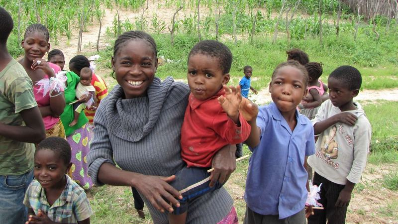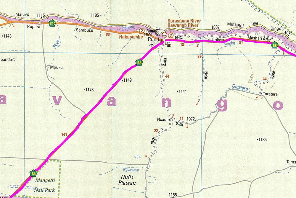 Lało całą noc i to bardzo obficie. Ciężkie chmury rankiem wykraplają jedynie mżawkę. Jedziemy do położonego obok kempingu skansenu, przedstawiającego zabudowę wiosek poszczególnych plemion, zamieszkujących rejon Namibii. „Tsumeb Cultural Village” (wstęp 44N$ od os.). W muzeum, jest trochę ozdób z drewna, strusich jajek, koralików, skór i kości zwierząt. Przy skansenie-muzeum znajduje się również kemping, ale obecnie wszystko nie funkcjonuje – pusto, cicho i ponuro. Teraz pozostaje nam pokonać trasę, dzielącą nas od granicy z Botswaną. Jedziemy najpierw z Tsumeb drogą C 42 do Grootfontein, a następnie trasą B8 w kierunku miejscowości Rundu, położonej nad rzeką Cubango, na granicy z Angolą. Po przekroczeniu granicy z prowincją Kavango, w Mururani Gate, wkraczamy na tereny Mangetti N.P. Od tego momentu poruszamy pomiędzy siedliskami plemion Kavango. Przygotowani technicznie, pompujemy piłki, baloniki, rozdajemy prezenty i słodkości, wprost w plemiennych osadach i wioskach. Mniej więcej już wiemy, jak to logistycznie opanować, choć dzieciaki ze swoją spontanicznością, są czasem nie do okiełznania.