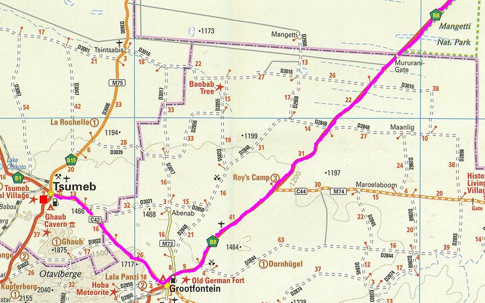 Późnym popołudniem wyjeżdżamy z parku i ponownie drogą C38 i B1 prowadzącymi na płd.-wsch., już o zmroku docieramy do miejscowości Tsumeb, gdzie przy „Kupfer Quelle Resort”, kompleksie wyjątkowo luksusowym, zaopatrzonym w baseny, restaurację i sklepy, zostajemy na kempingu (230N$). Niestety po czterech tygodniach od wyjazdu z Polski, pora wreszcie jest właściwa, czyli deszczowa i po opuszczeniu Etosha N.P. zaczęło padać… a my, jemy pierwszą konserwę z Polski.