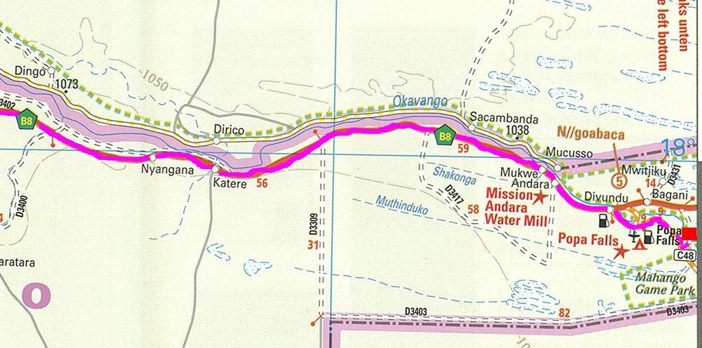 Po dotarciu do Rundu, uzupełniamy nasze braki kilinarno- smakowe, konsumpcją pół kg steka (jesteśmy zatrważająco monotematyczni w strefie wyżywienia). Kontynuując jazdę na wschód docieramy do miejscowości Popa Falls, położonej nad rzeka Okavango, tuż przy granicy z Botswaną. Na campie „Ngepi Camp”, polecanym przez Lovely Planet, położonym nad samym jej brzegiem pozostajemy na nocleg (200N$ za stanowisko). Camp organizuje pływanie po rzece, by podglądać hipopotamy (200N$ od os., ale muszą być min.4 os.). nie popłynęliśmy, bo chętnych nie było. Nawiązując do pogody, to w połowie trasy deszcz i ciężkie chmury nieco odpuściły i nawet czasem przejrzało słońce, temperatury natomiast zupełnie umiarkowane w okolicy 25ºC, rankiem było tylko 18ºC.