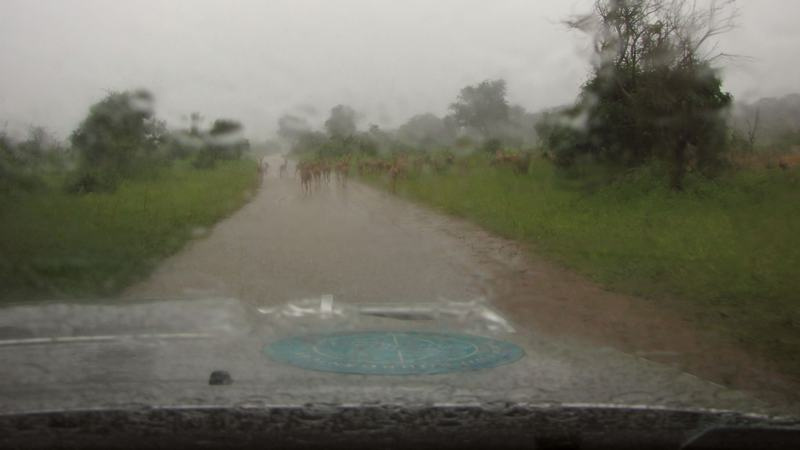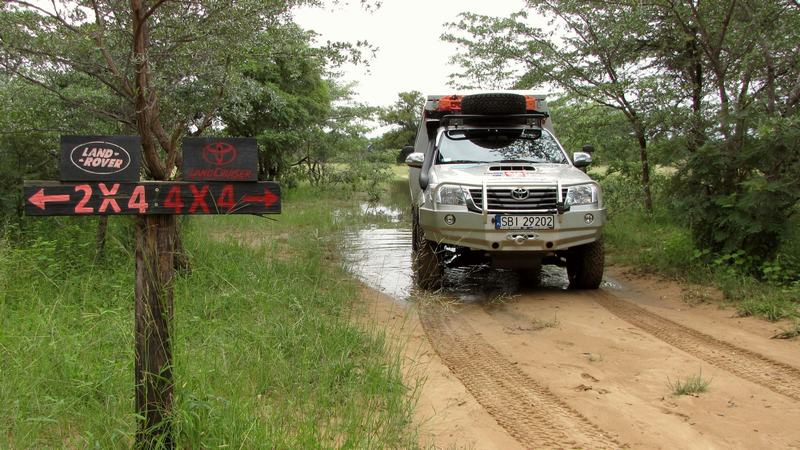 Rano szybki, 60km przejazd na płd.-wsch., drogą B8 do granicznej osady Ngoma Bridge, położonej nad rzeką Chobe, na granicy z Botswaną. Info dla tych co jadą w tym kierunku pojazdem, nie ma tu stacji paliw, natomiast są kempingi, prowadzone przez mieszkańców miejscowych wiosek. Odprawa do Botswany trwała 10minut, po umyciu opon auta, wytarciu butów w dość mocno zużytą szmatę, jeszcze tyko płacimy 290pula (opłata za wjazd, ubezpieczenie auta i podatek drogowy – karnet CPD nie jest potrzebny). 1pula = 0,38zł, namibijskie pieniądze nie są honorowane, natomiast, bez problemów można płacić randami RPA, $USD i € (1USD = 8pula). Dosłownie na samej granicy, 10m za szlabanem wyjazdowym, znajduje się wjazd do „Chobe National Park”. Płacimy 36$USD, co daje w rozbiciu 120pula od os., plus 50pula za pojazd i jedziemy przez park do miejscowości Kasane, ok. 65km. To nie parki RPA i Namibii, to dziki park, tak naprawdę bez wyraźnych oznaczeń i utwardzonych dróg. Wpisując się w książkę meldunkową, zauważyliśmy że ostatnimi turystami, którzy tu wjeżdżali byli włosi i to tydzień temu. Przemieszczamy się w bardzo spokojnym trybie, nieświadomi tego, co się dopiero wydarzy, tymczasem jak to bywa w porze deszczowej, dopadła nas afrykańska burza. Świata nie widać, pioruny walą z nieba, w jednej chwili skromny ślad drogi, zamienia się w koryto rzeki. Na szczęście podłoże jest twarde i piaszczyste, więc nie brniemy w błotnej masie. Jednak zagłębienia terenu zamieniają się natychmiast w jeziora i czasem, aby je pokonać… woda sięga połowy drzwi. Intryguje zachowanie zwierząt, gromadzą się w grupy i zastygłe w ruchu, tkwią nieruchomo pod drzewami.