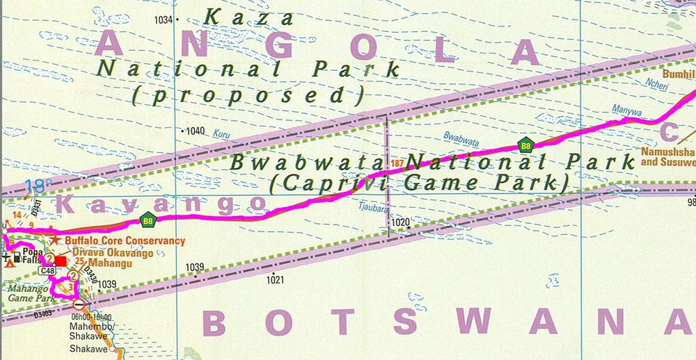 Miejsce okazało się być rzeczywiście wyjątkowym, cisza zakłócana tylko przeróżnymi dźwiękami „ptasiego radia” i zwierząt, w szczególności małp. Toalety i prysznice wkomponowane w naturalny busz, a komarów wystarczająco, by czym prędzej uciekać. Po opuszczeniu kempingu, jedziemy na południe drogą C48, do polecanego przez właścicieli campu, „Mahango Game Reserve”, znajdującego się na pograniczu Namibii i Botswany (wstęp 40N$ od os. i 10N$ od auta, obowiązuje segregacja, europejczycy płacą najwięcej… o czym to świadczy?). Pomimo, że park nie jest zbyt rozległy to warto go odwiedzić, mamy nieodparte wrażenie, że musiał być scenograficznym tłem do wielu filmów Disneya o zwierzętach.