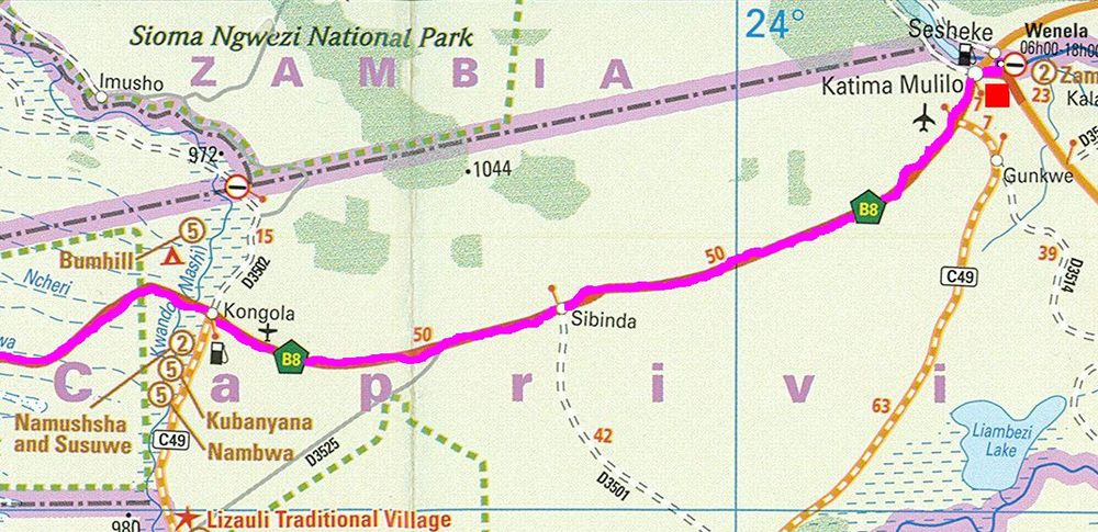 Teraz pozostało nam przemieścić się 350km na wschód drogą B8, do miejscowości Katima Mulilo (brzydkie, jak wszystkie inne) położonej na granicy z Zambią, nad rzeką Zambezi. Pierwsze 190km przebiega przez Bwabwata N.P. Żyje tu ogromna populacja słoni, jednak w porze deszczowej rozproszone są w buszu i nie było nam dane zobaczyć żadnego… jedynie co nam się udało, to popatrzeć na ich wielkie kupy, na których buszują (czyżby to był obiad?) wielkie żuki i drobniutkie motylki. Po uzupełnieniu zapasów, zostajemy na nocleg na campie, nad samym brzegiem rzeki Zambezi w kompleksie „Protea Hotel Zambezi River”. Stanowisko kempingowe (260N$ od naszego zestawu). Kolacja w resortowej restauracji i… chyba już nie ma sensu pisać co jemy… 400g steki T-bone, może ostatnie w Afryce, gdyż jutro rozpoczynamy przejazd, przez mniej cywilizowane kraje tego regionu, a zaczynamy od Botswany.