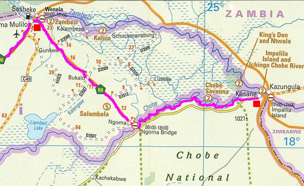 Mieliśmy tu pozostać na następne dwa dni i nieco oporządzić się po miesięcznej podróżny, ale z powodu braku dostępu do internetu, przesunęliśmy te decyzję na następne miejsce postojowe. Ruszamy więc rankiem na granicę z Zimbabwe, oddalona od Kasane o 15km. Odprawa 15minut, na miejscu wystawiono nam wizy wjazdowe, płatne 30$USD od os., natomiast za auto 55$USD (obejmuje podatek drogowy, opłatę za wjazd i ubezpieczenie pojazdu). Takiej sprawności w obsłudze, nigdy byśmy się nie spodziewali tu w Afryce, mając na uwadze i w pomięci, te koszmarne przeprawy przez granice w Ameryce Południowej, a w szczególności w Środkowej.