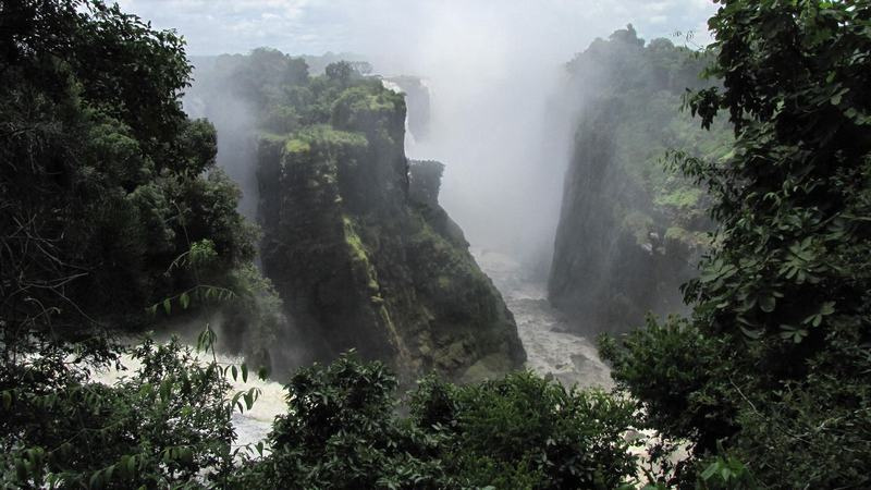 I rzeczywiście wrażenia niesamowite, woda zlewa się z hukiem z wysokości 107m, na długości 1737m skalnego czoła wodospadu. Bryza wytworzona przez spadającą wodę, unosi się na dziesiątki metrów w powietrze. Trudno zrobić dobre zdjęcia, gdyż mżawka i drobny deszcz namaczają nam wszystko, łącznie z aparatem. Kompletnie przemoczeni, odwiedzamy wszystkie 16 punktów widokowych. Rzeczywiście, panorama wodospadów od strony Zimbabwe jest zdecydowanie lepsza, niż od Zambii. Teraz, kiedy już zobaczyliśmy „Wielką Trójkę”, największych wodospadów świata, możemy ocenić i podać nasz ranking. Iguazu pozostaje na pierwszym miejscu, zachowując podium, druga pozycja Victoria, a na trzecim Niagara, osobiście przed Niagarą ustawilibyśmy jeszcze w szeregu, wenezuelski najwyższy (980m) wodospad naszego globu, Salto Angel, ale to taka nasza zupełnie subiektywna ocena.