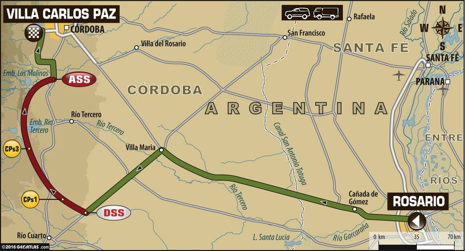 Organizatorzy trzykrotnie przekładali start oesu, aż w końcu zdecydowali o jego odwołaniu. Wszystko ze względu na to, że nie mogły wystartować helikoptery bezpieczeństwa – warunek rozpoczęcia każdego rajdowego dnia. Deszcz co prawda w końcu ustał, ale trasa była zbyt mokra i niebezpieczna dla zawodników. Organizatorzy odwołali więc start pierwszego etapu. Tym samym kibice oraz zawodnicy, którzy rwą się już do rywalizacji będą musieli czekać na prawdziwy start zmagań do poniedziałkowego poranka. Kierowcy mieli się ścigać na trasie z Rosario do Villa Carlos Paz.